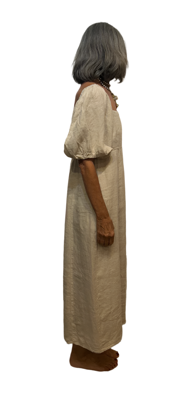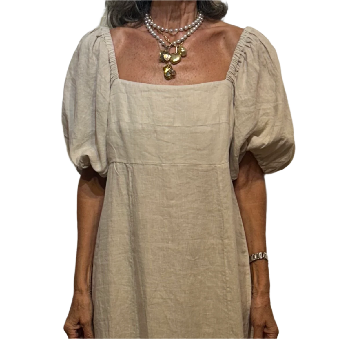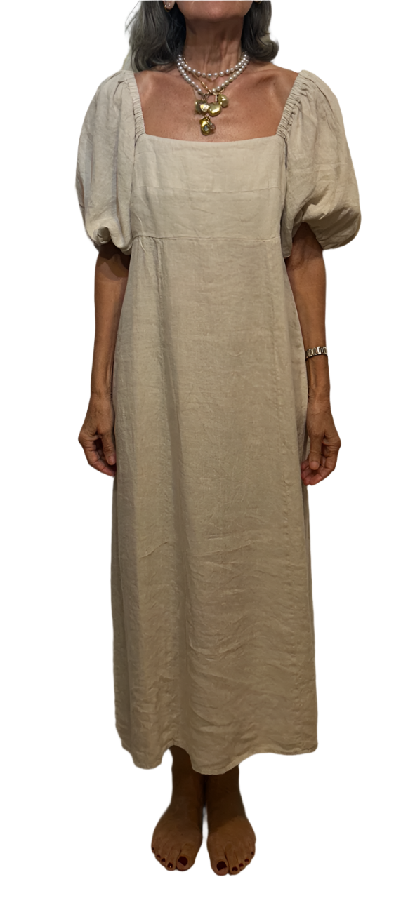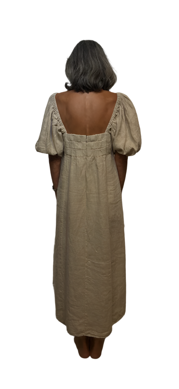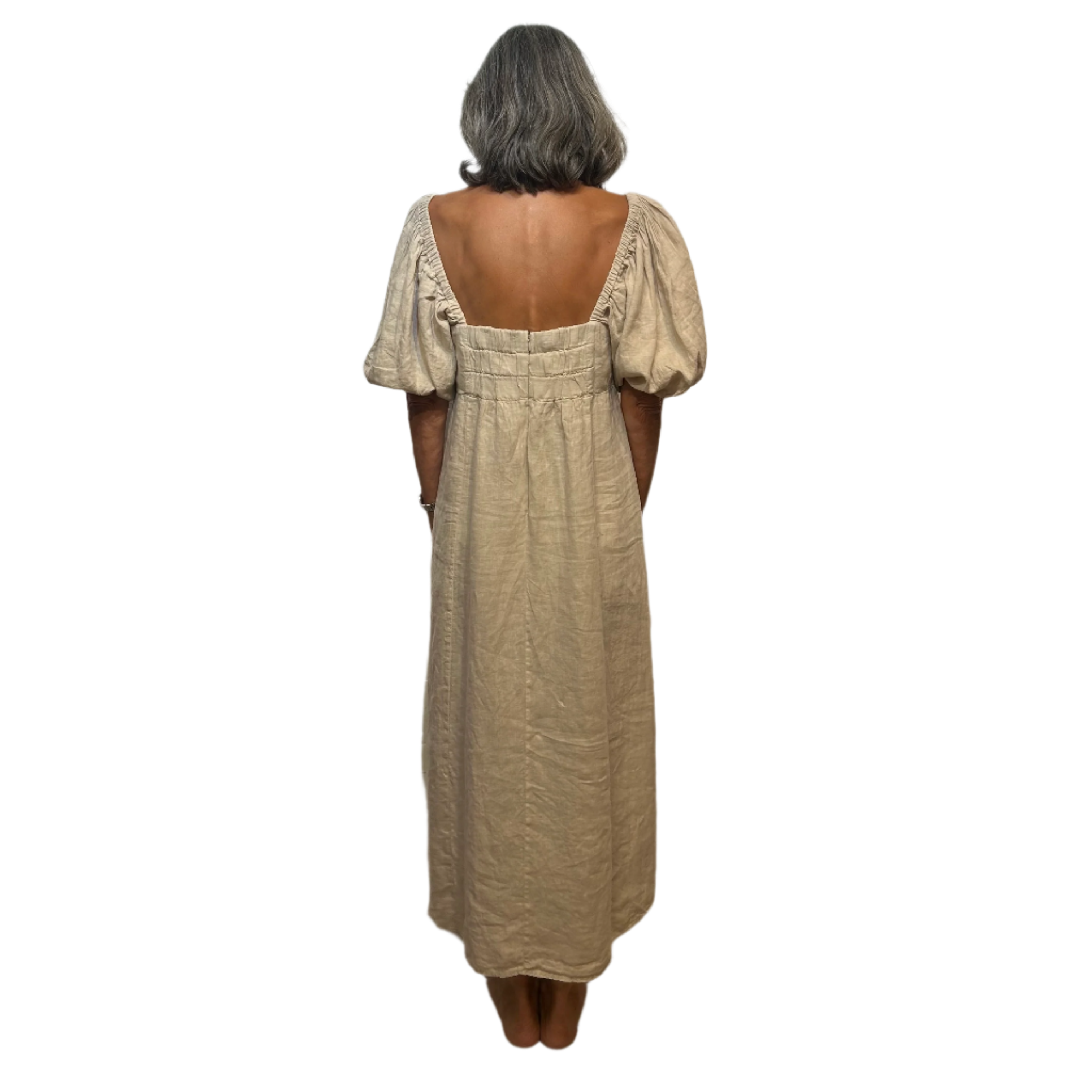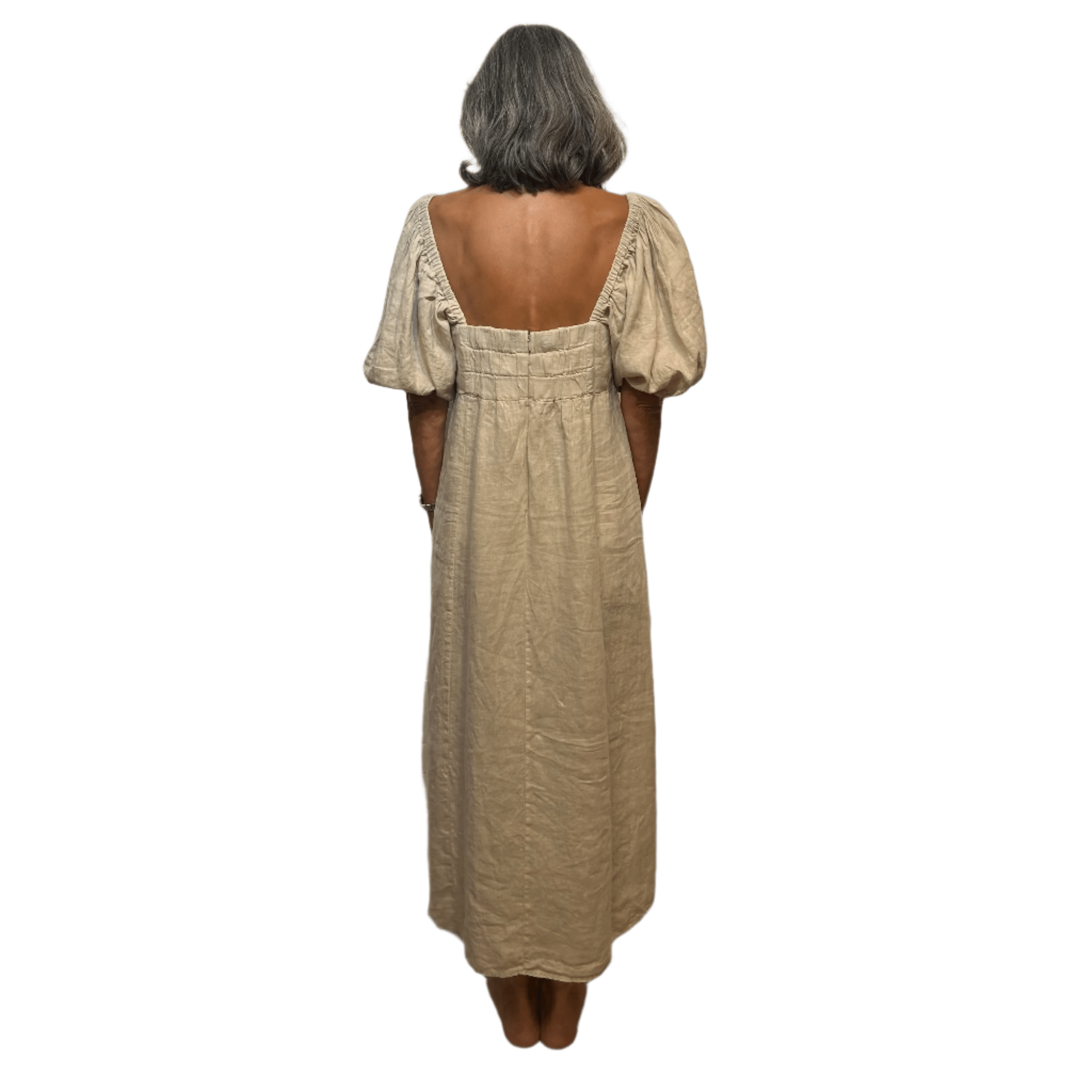 Made from lightweight woven linen, this midi dress features a square neckline and voluminous puff sleeves for a timeless silhouette. Elastic details on the shoulders, cuffs, and yoke add texture, while the hidden rear zipper ensures effortless wear.