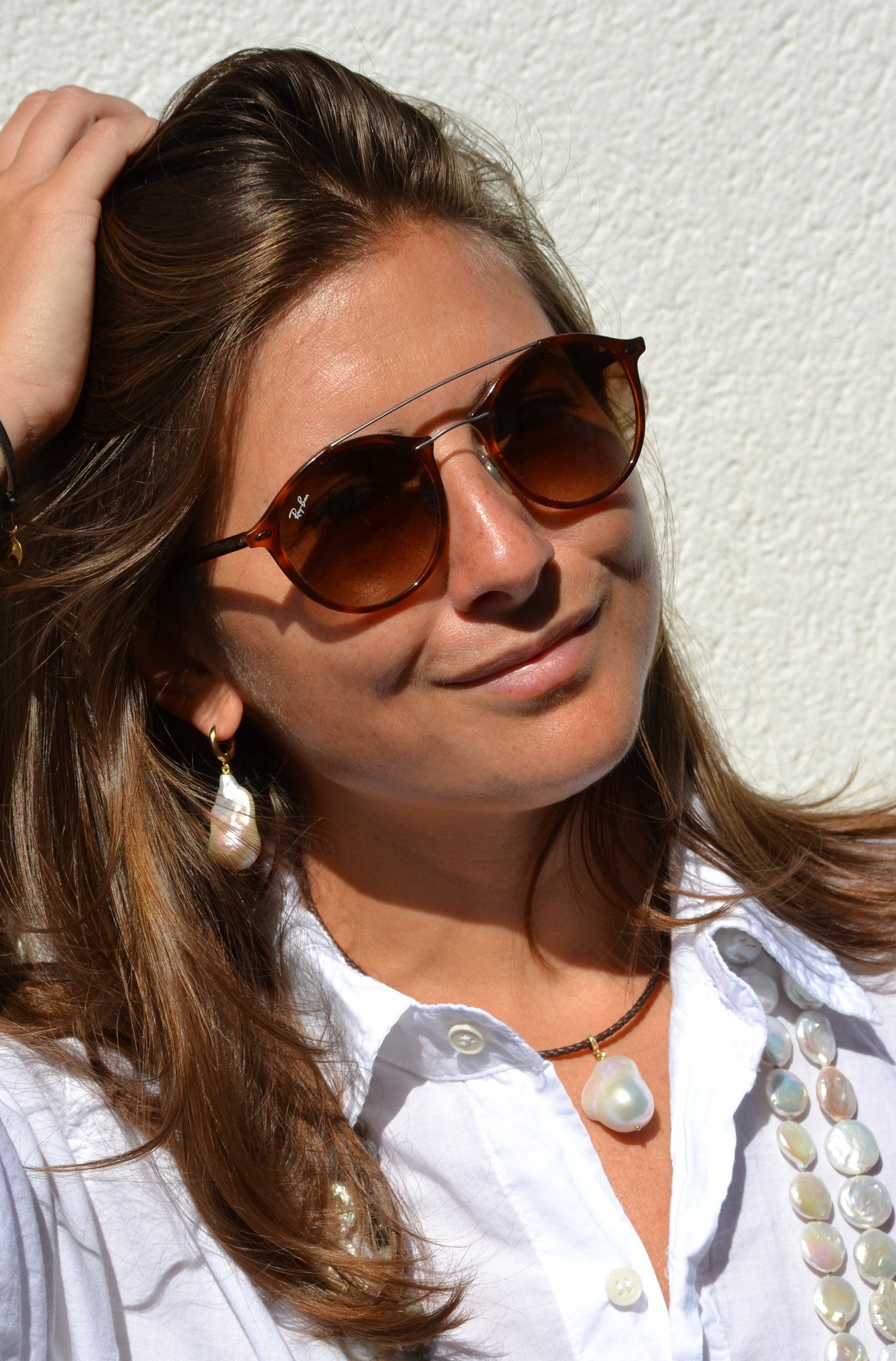 Large White baroque freshwater pearl on a 14k gold huggy -- very comfortable and surprisingly not heavy. (May or may not come with the gold bits on the end ... depends on pearls).