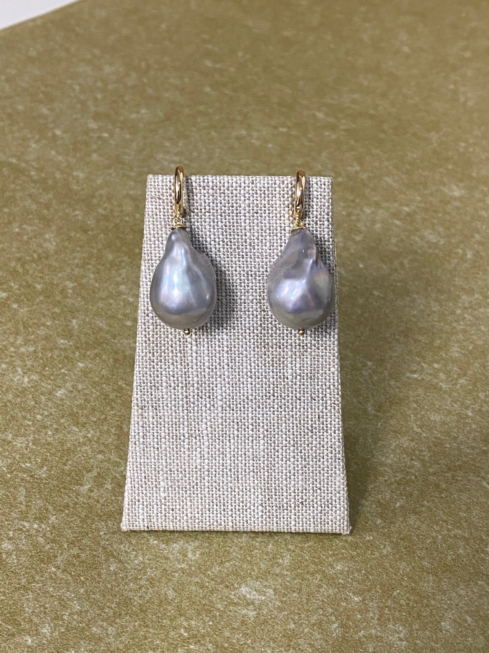 Large Grey Baroque freshwater pearl on a 14k gold huggy -- very comfortable and surprisingly not heavy. (May or may not come with the gold bits on the end ... depends on pearls).