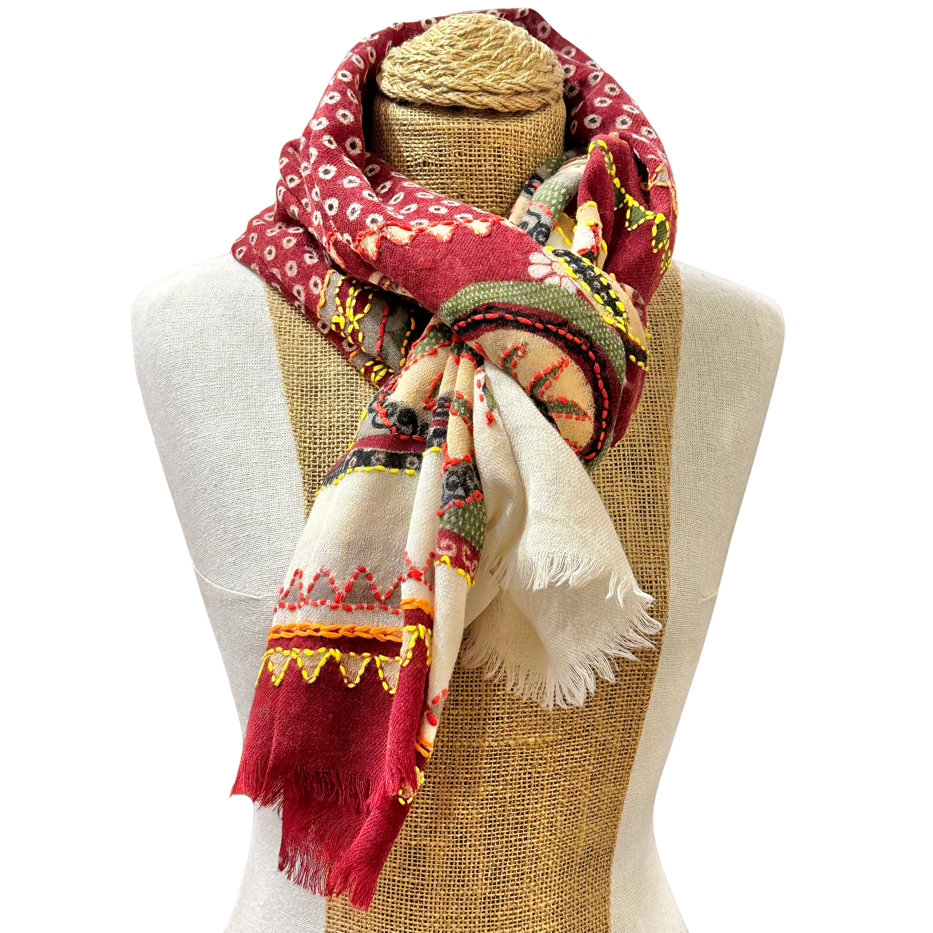 This product has been designed following traditional Indian dyeing and printing methods. Variations in color and print are not defects, but rather elements that add to the natural beauty and uniqueness of each scarf.