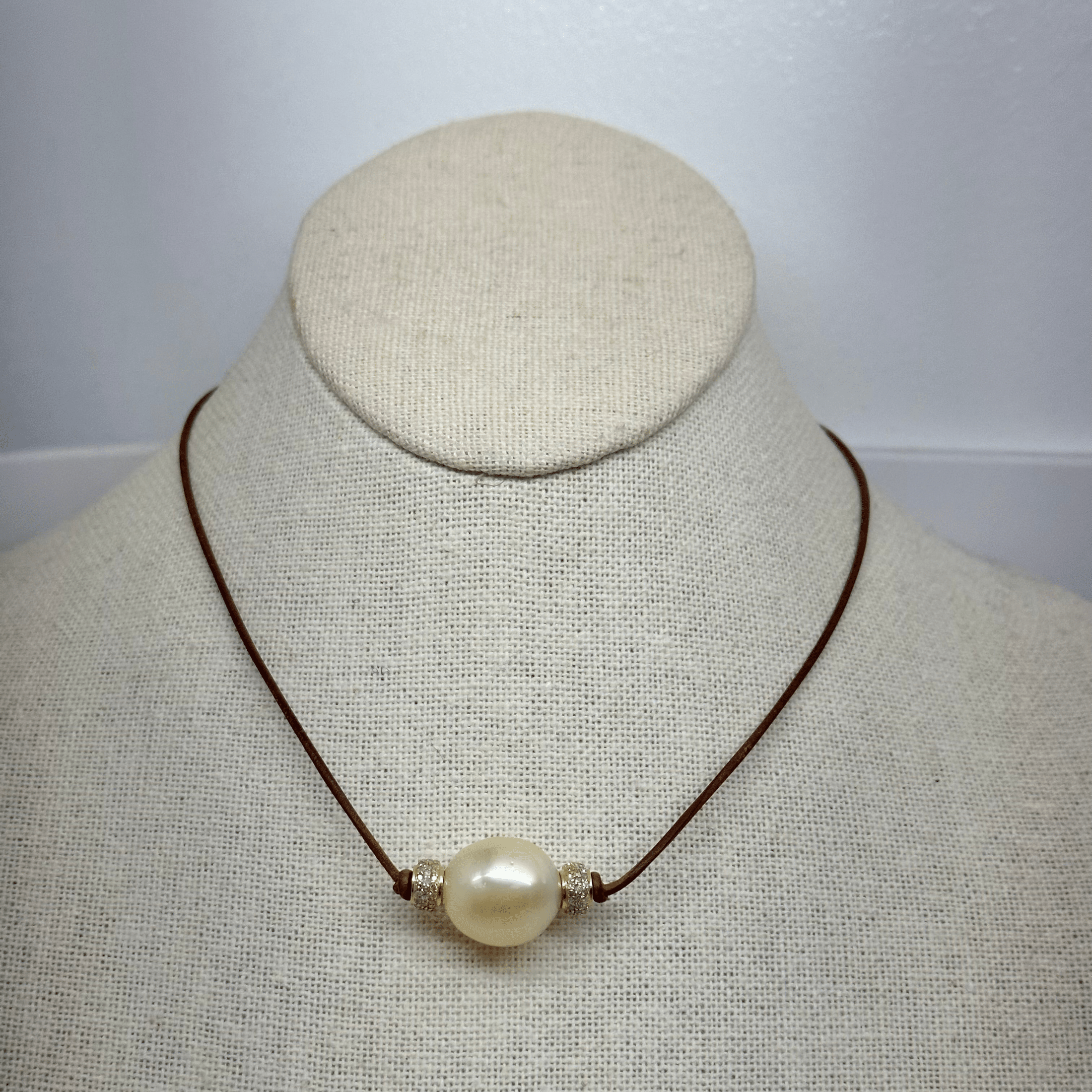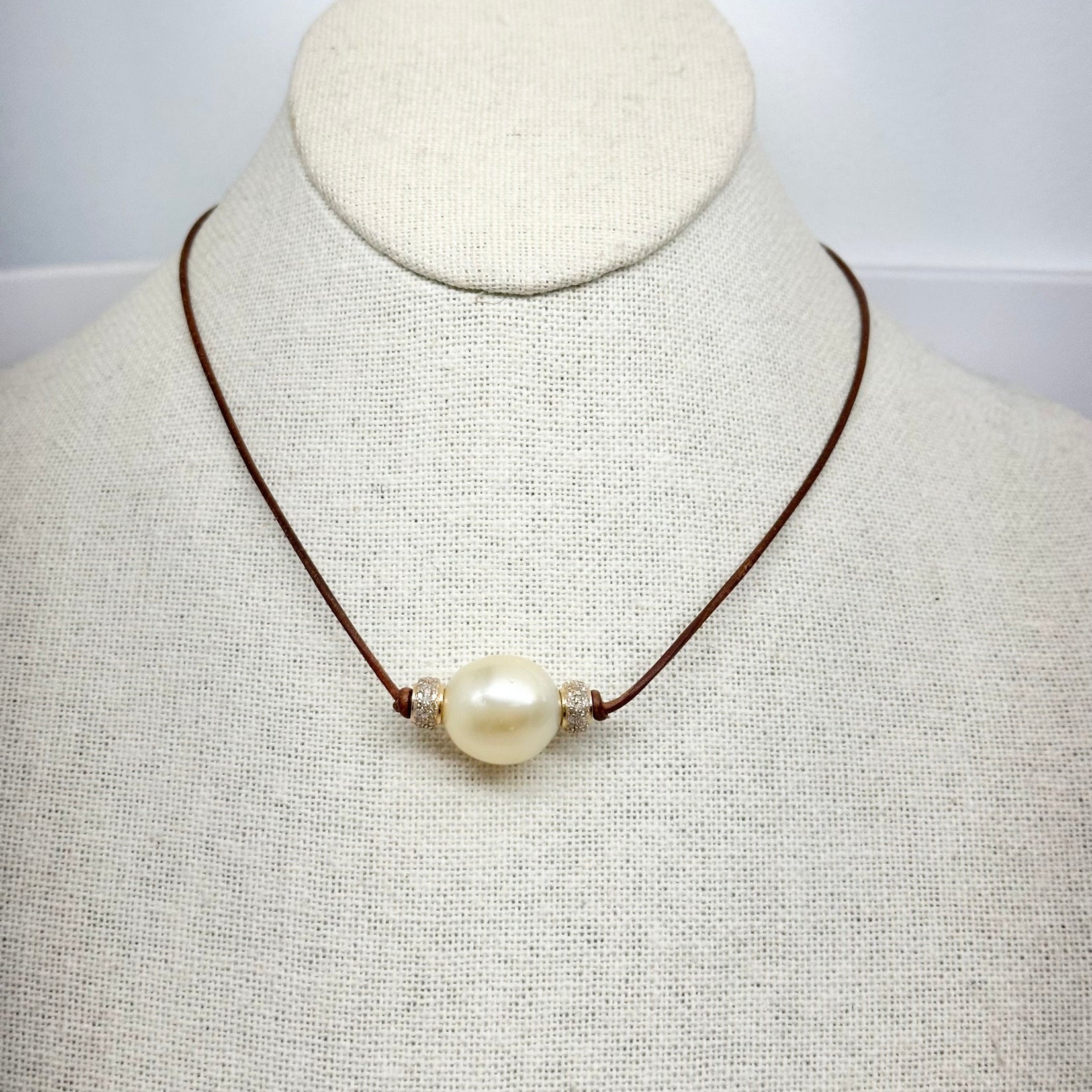 Large South Sea Pearl on Stitched Leather Choker | 15"