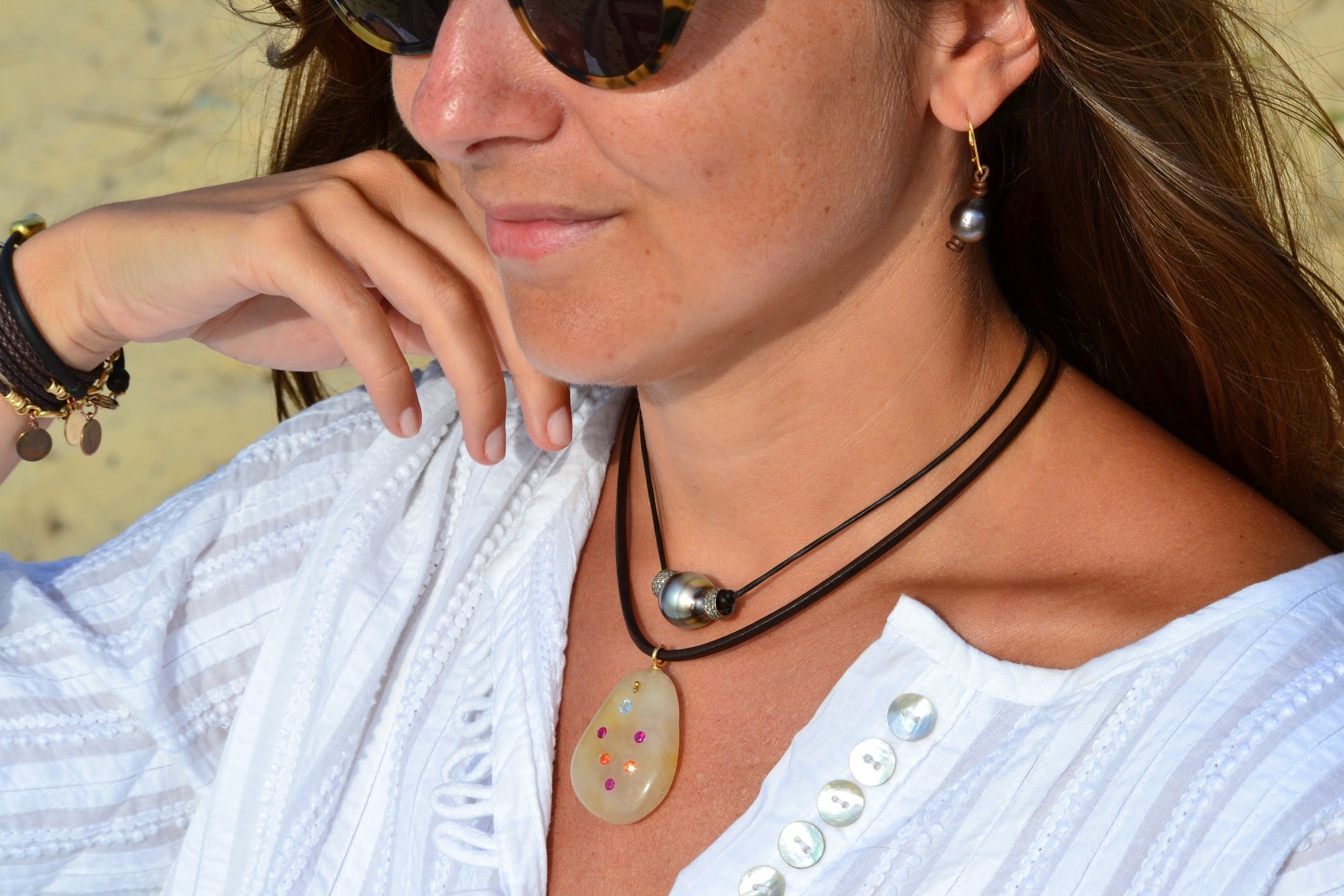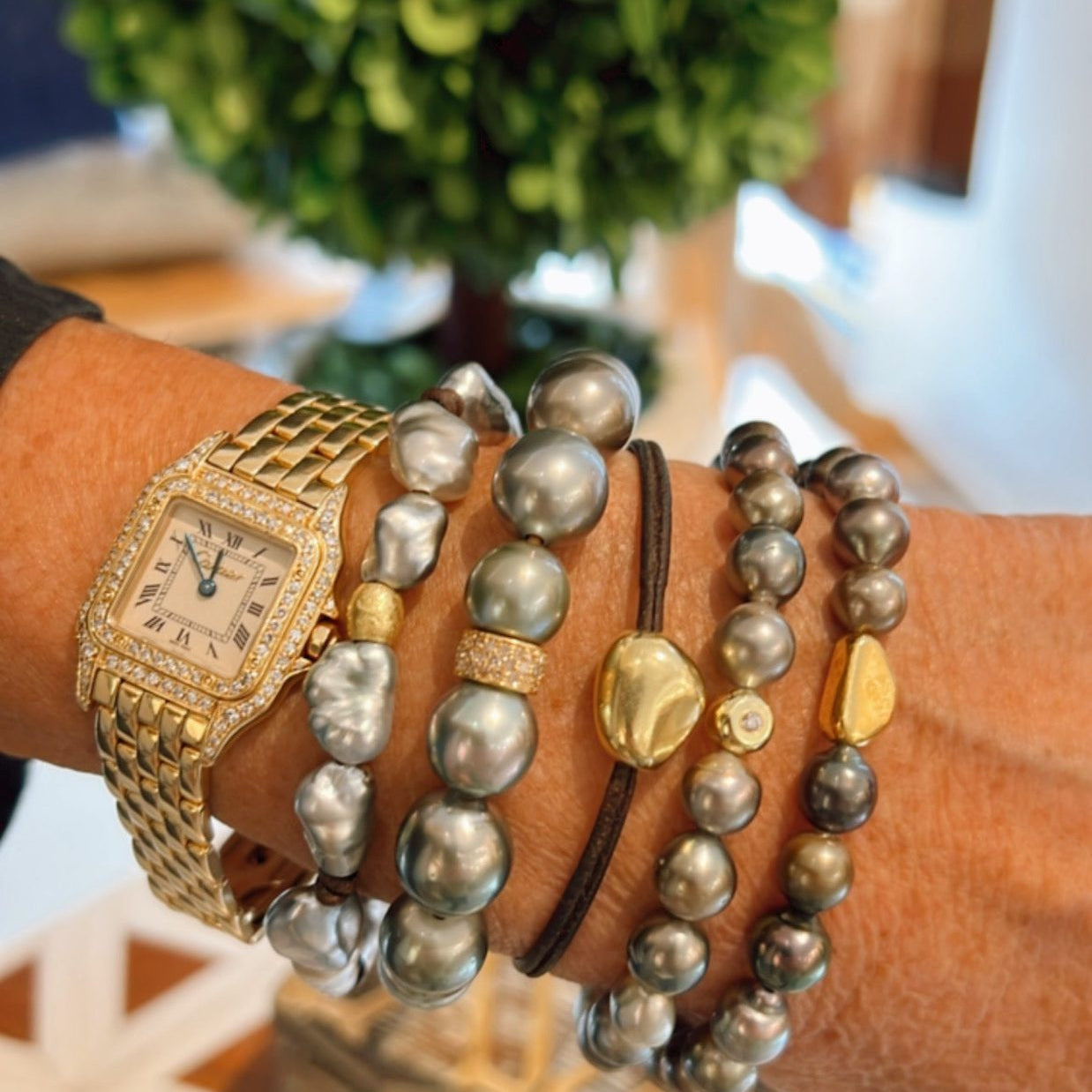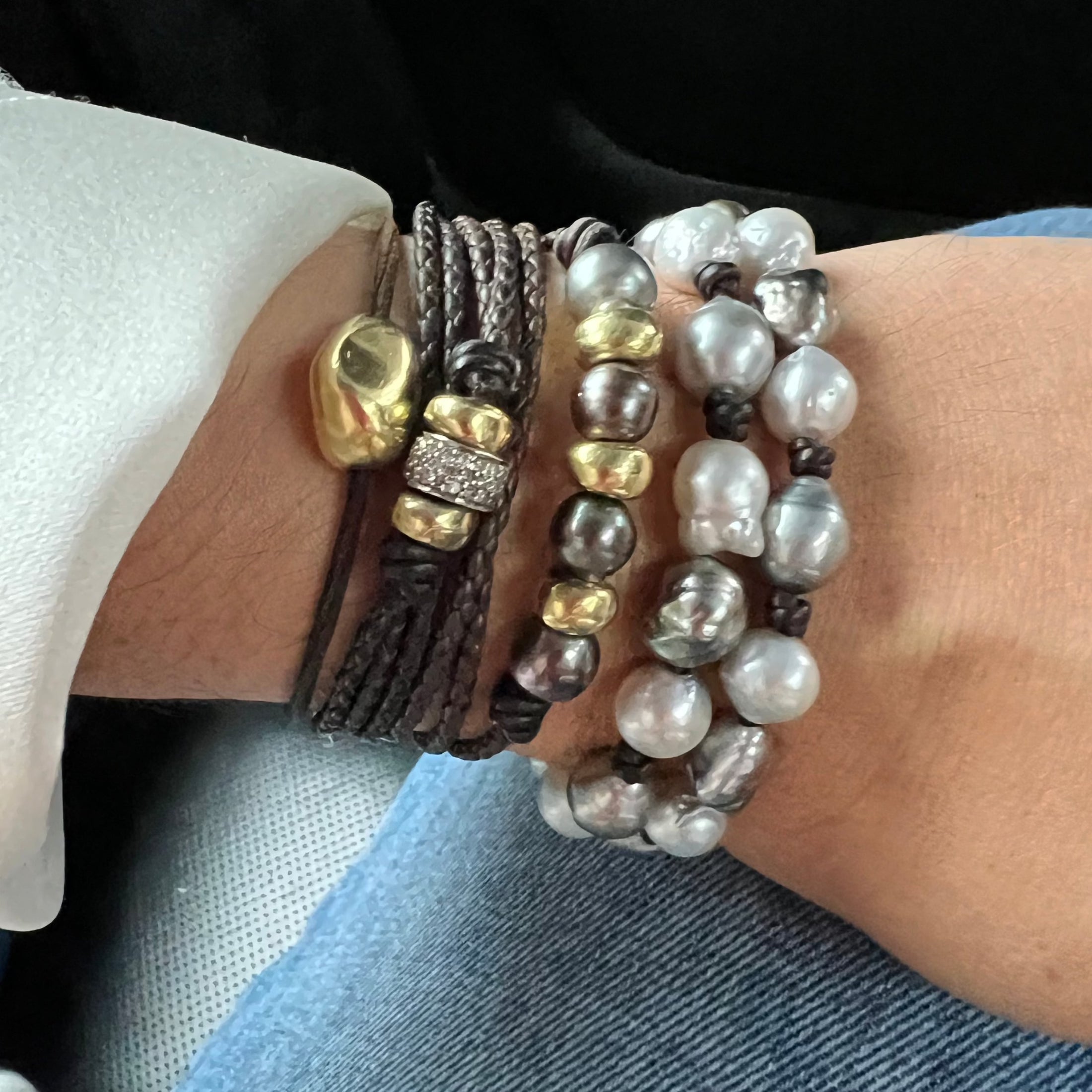 Lustrous Tahitian and South Sea pearls, hand-strung on supple leather — a stunning fusion of elegance and edge. Effortlessly transitions from laid-back luxe to evening chic.