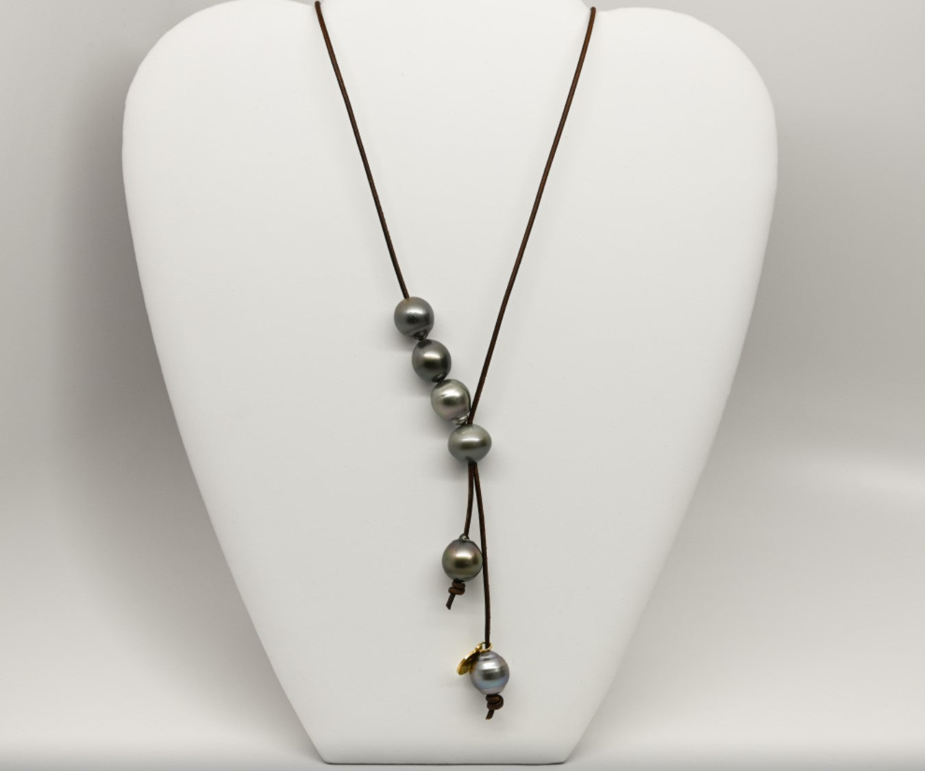 Genuine Tahitian Pearl adjustable necklace with 6 pearls on dark brown leather.