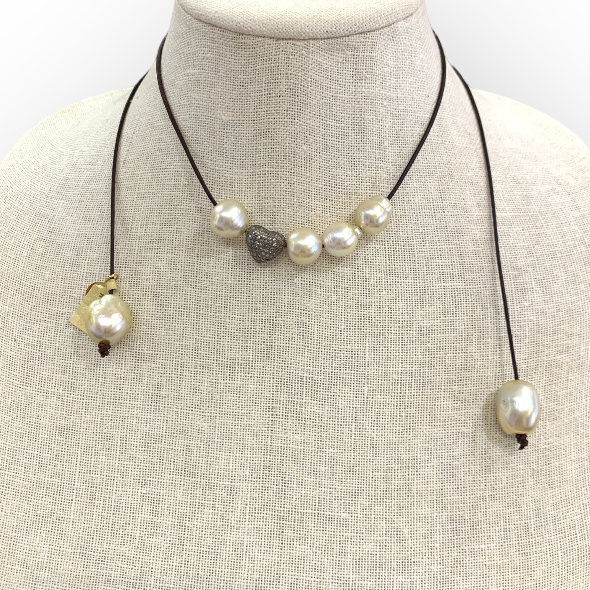 South Sea Pearls on premium leather with a Silver Pave Diamond Heart.