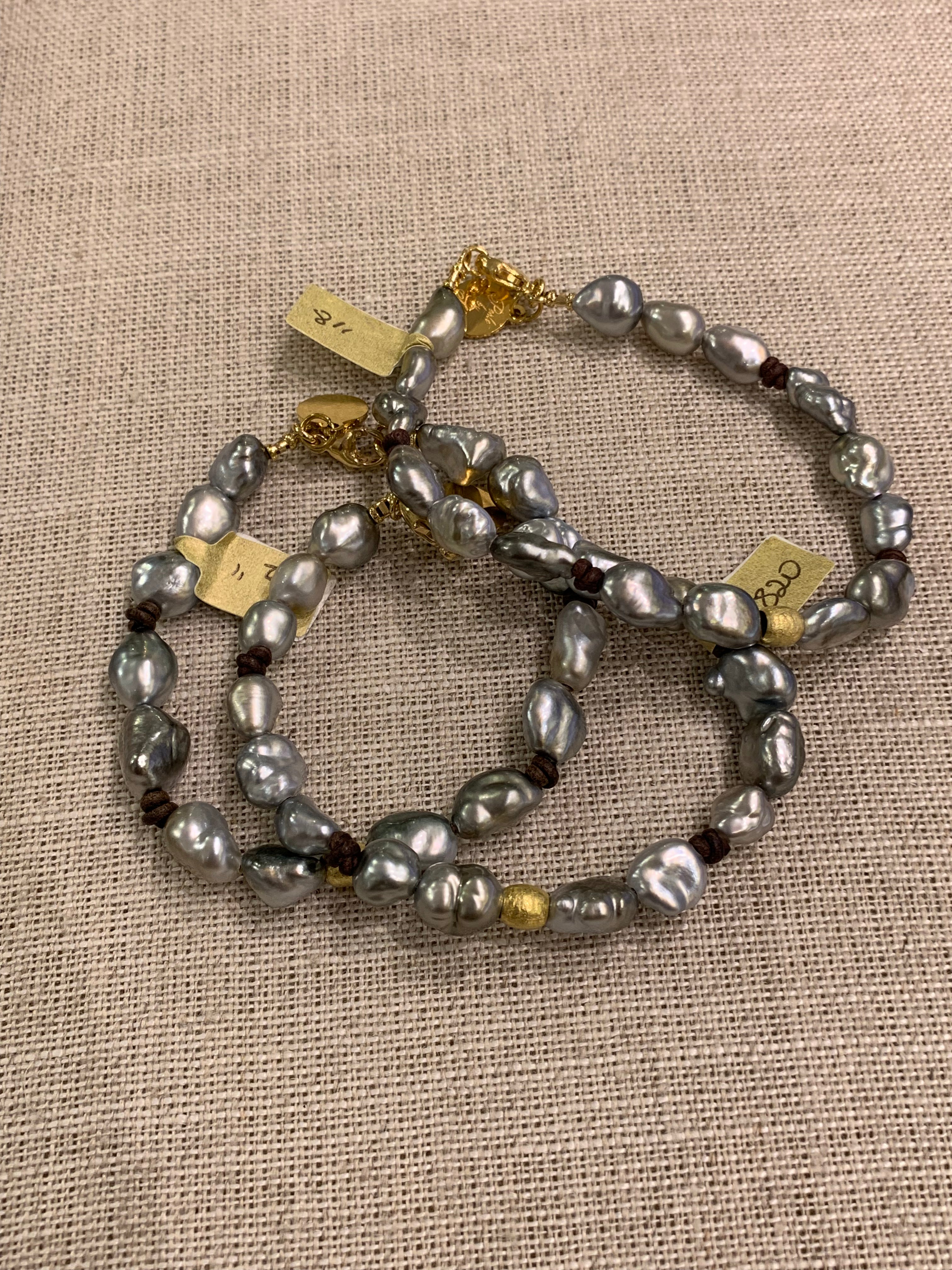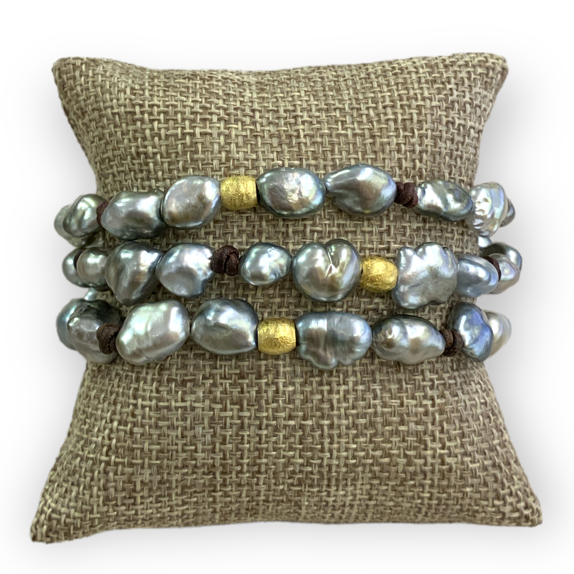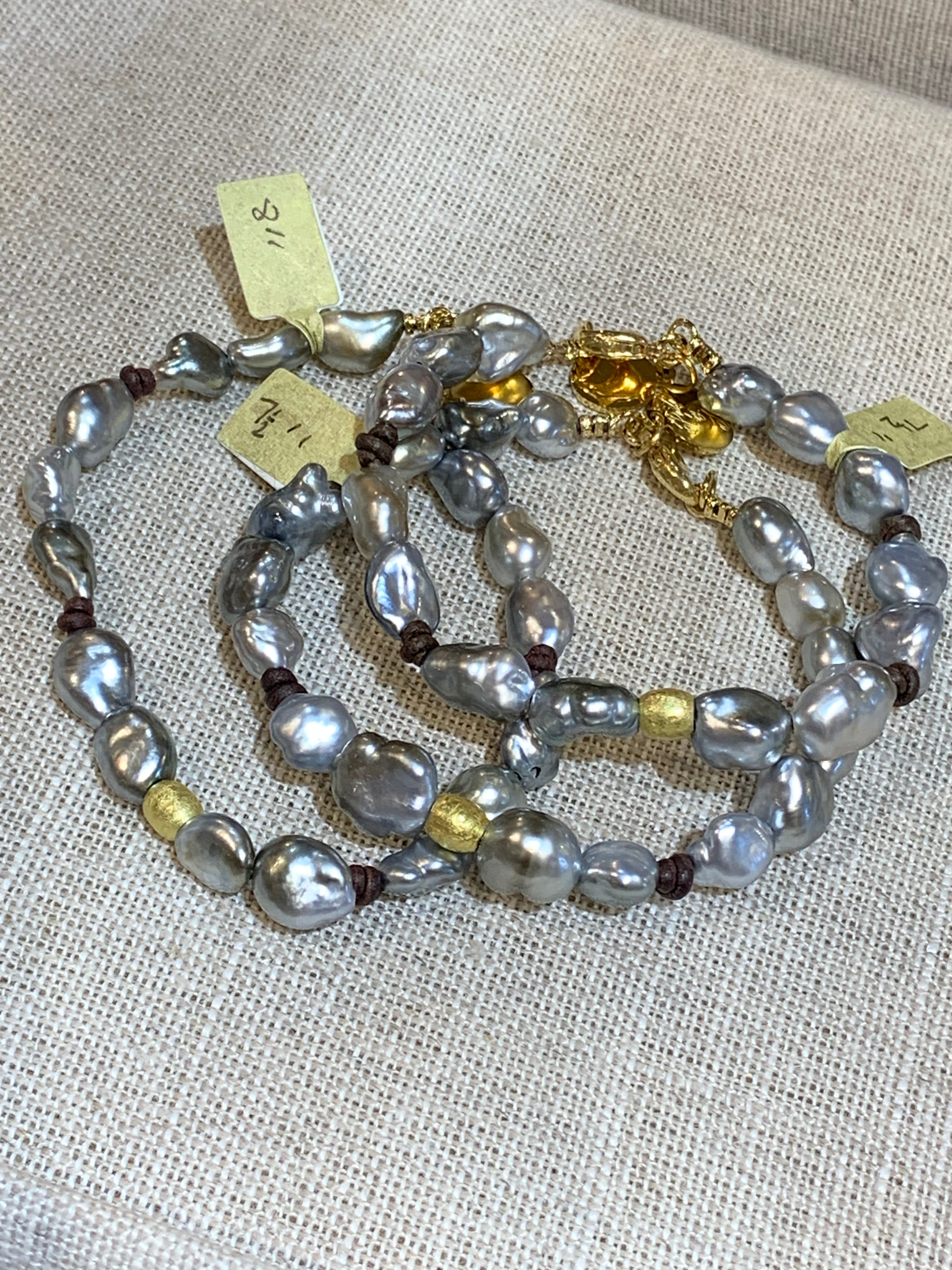 Keshi Pearls with an 18K Gold Rondell on leather with lobster clasp.