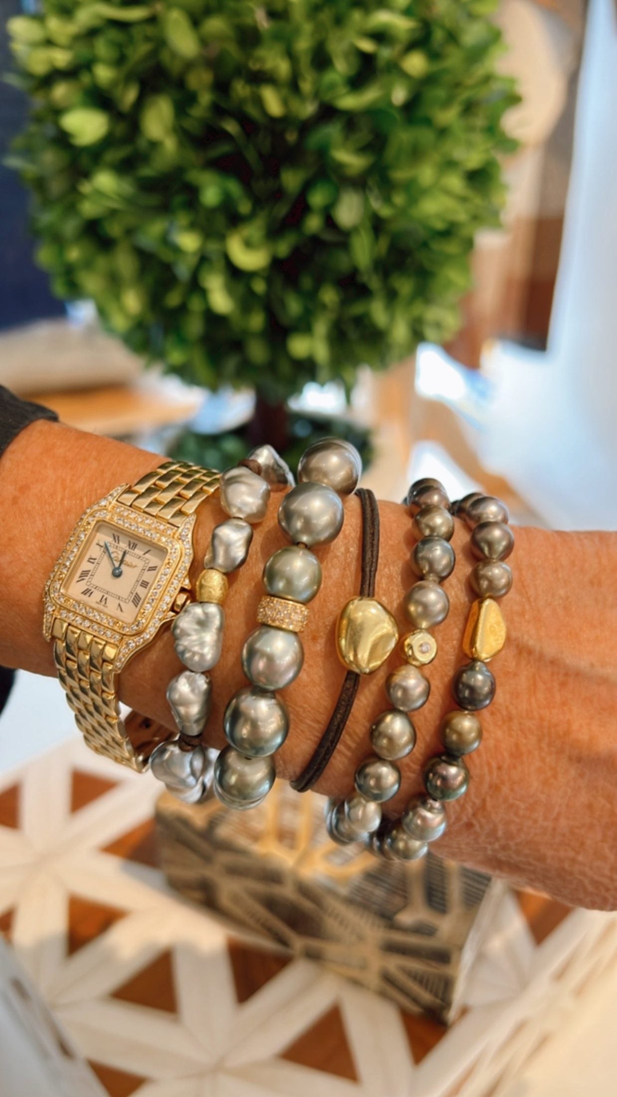 Discover understated luxury with this distinctive bracelet, where organic keshi pearls are paired with an 18K gold roundel and secured on supple leather with a reliable lobster clasp. A refined accessory that balances natural beauty with precious metalwork for the discerning wearer.