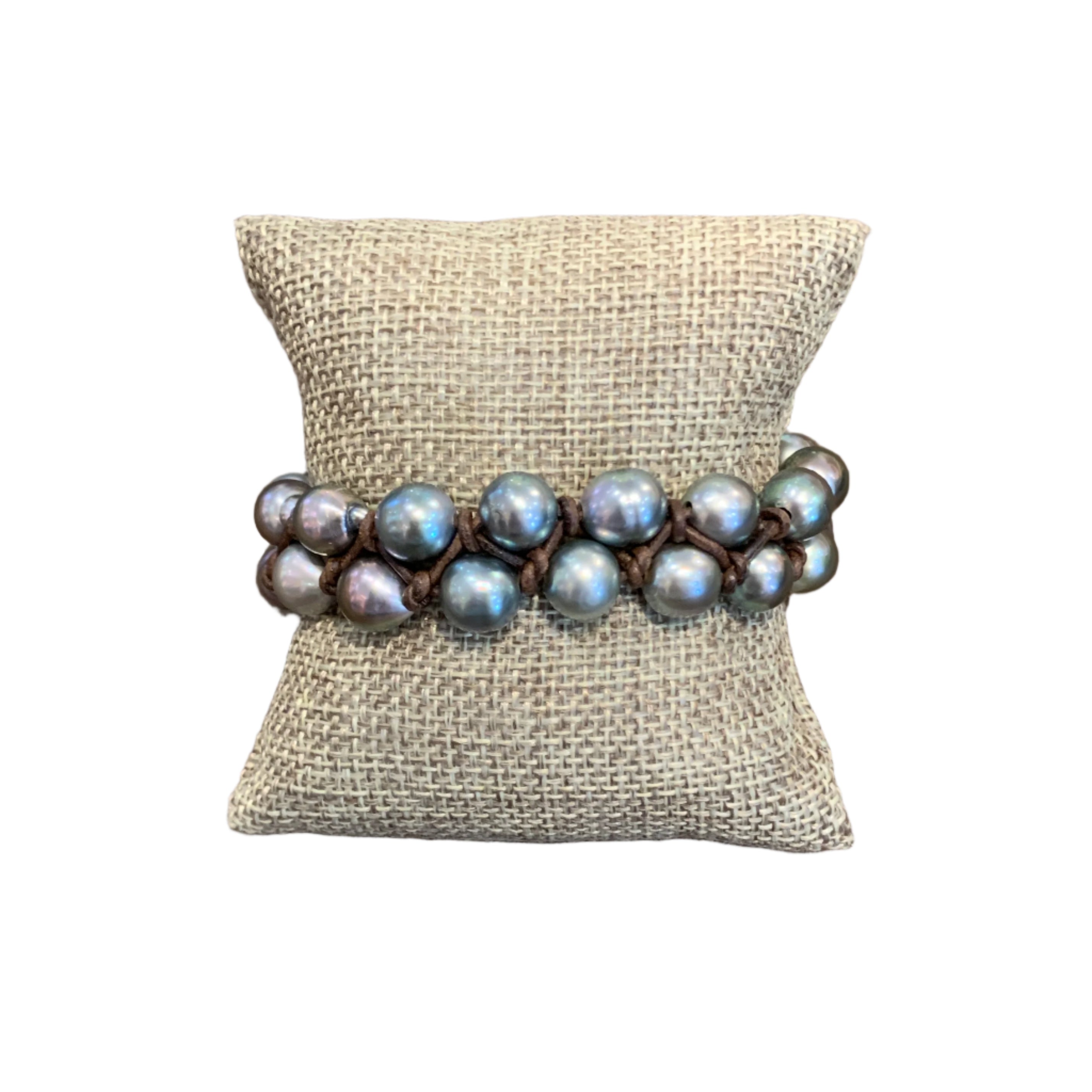 Bracelet with Tahitian Pearls on Dark Brown premium leather woven in macramé style.