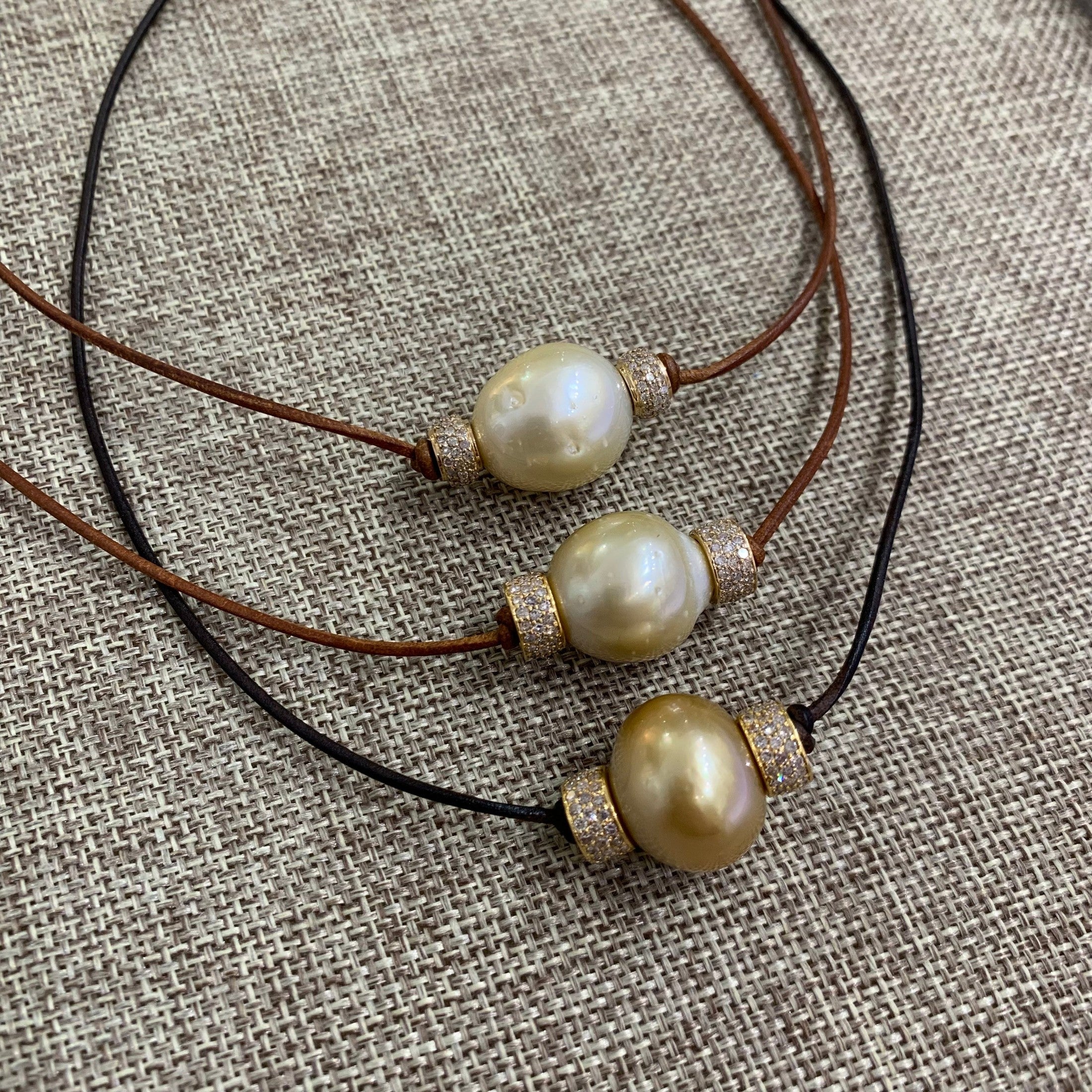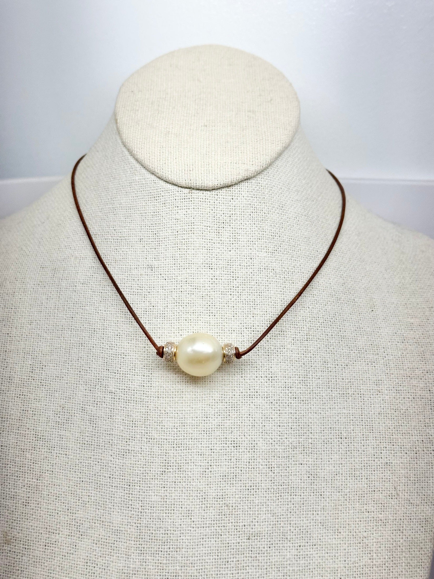 A luminous South Sea pearl takes center stage, flanked by gleaming gold pave diamond roundels that catch the light with every movement. This 16" piece combines timeless elegance with modern refinement, suspended on supple leather in your choice of rich dark brown or warm tan. Finished with a gold-plated lobster clasp for secure, effortless wear.