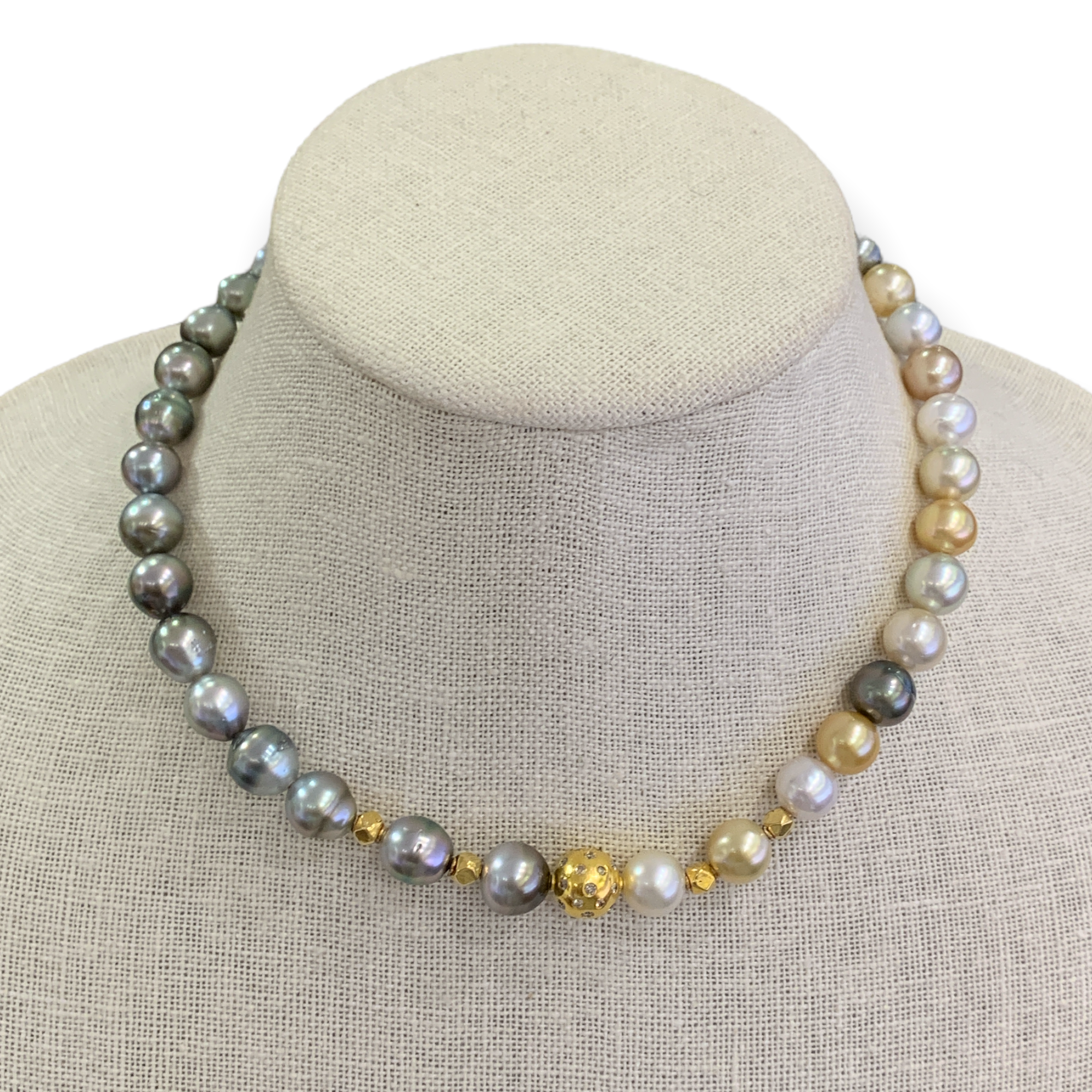 16.5" Mixture of Tahitian & South Sea Pearls on Tan Leather with 18K Gold Roundels and Gold/Pave Diamond Ball.