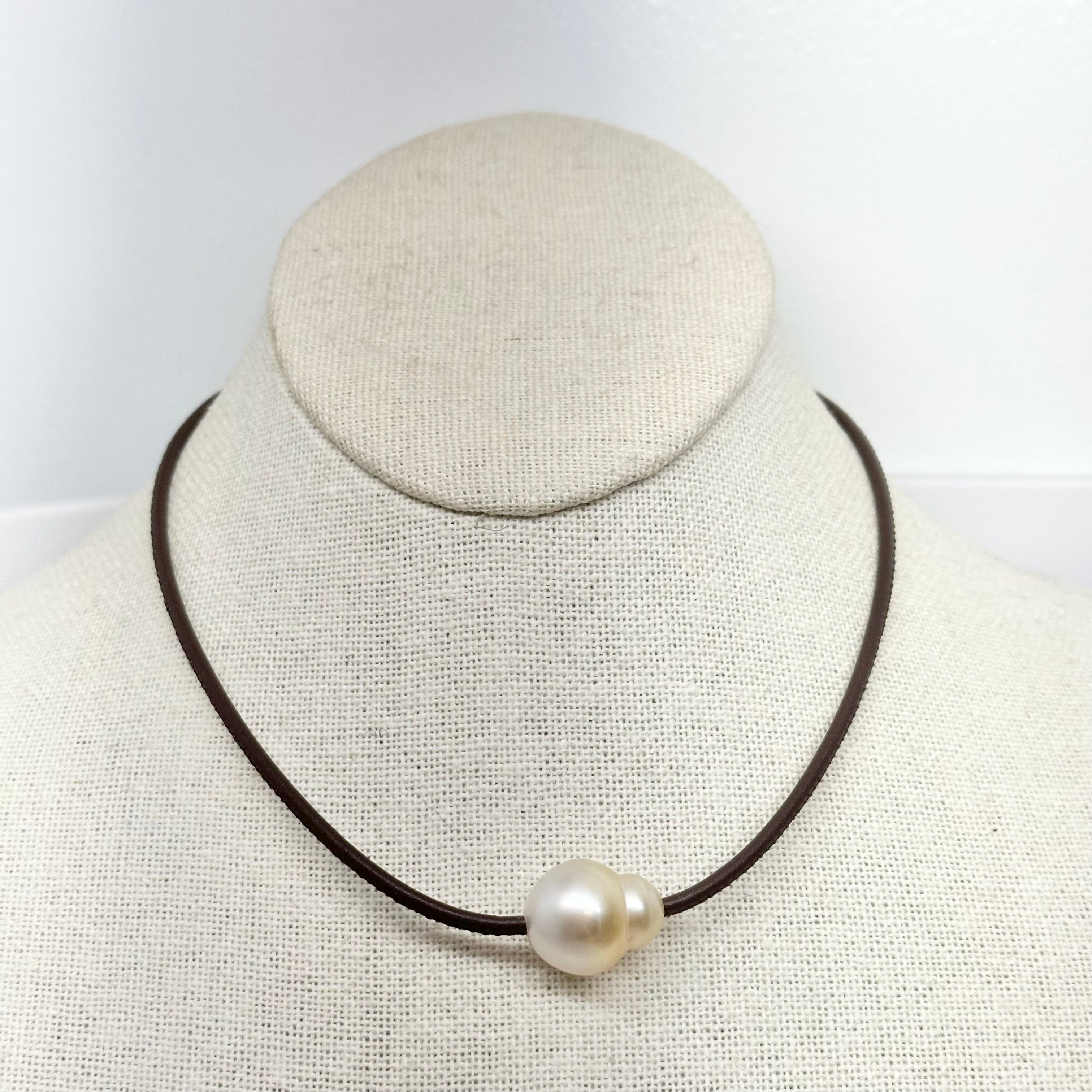Single Large South Sea Pearl (pearl color and style can vary) on dark brown stitched premium leather.