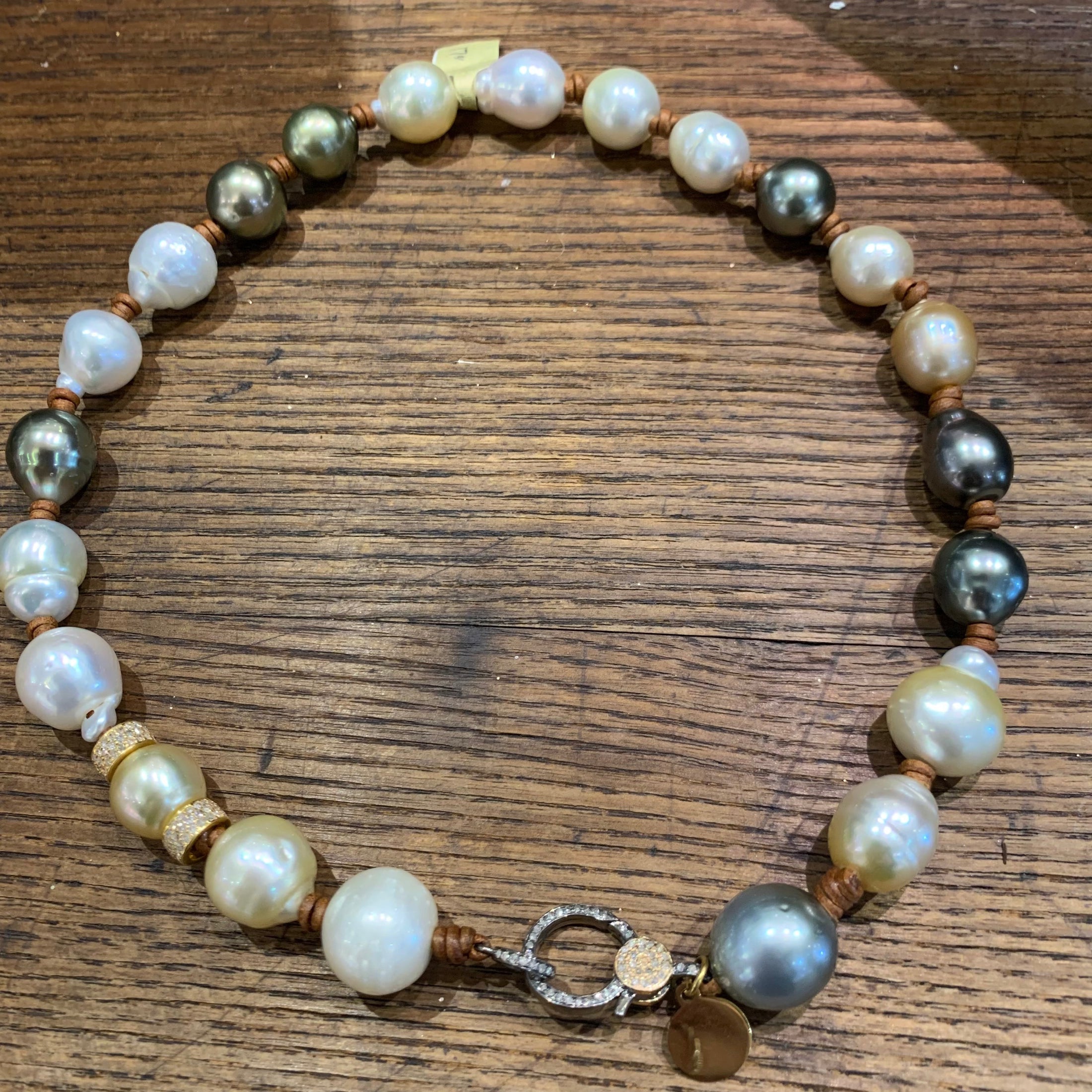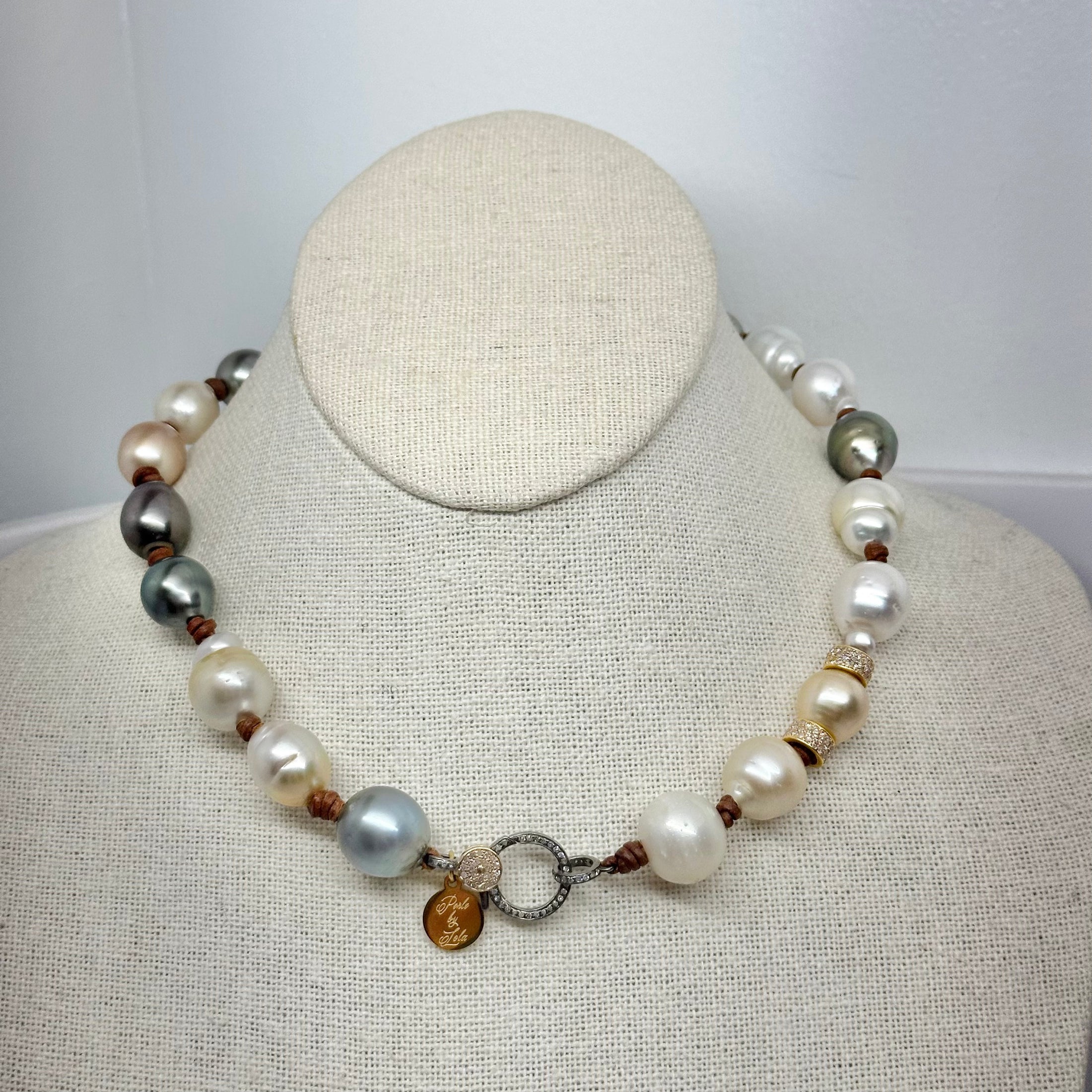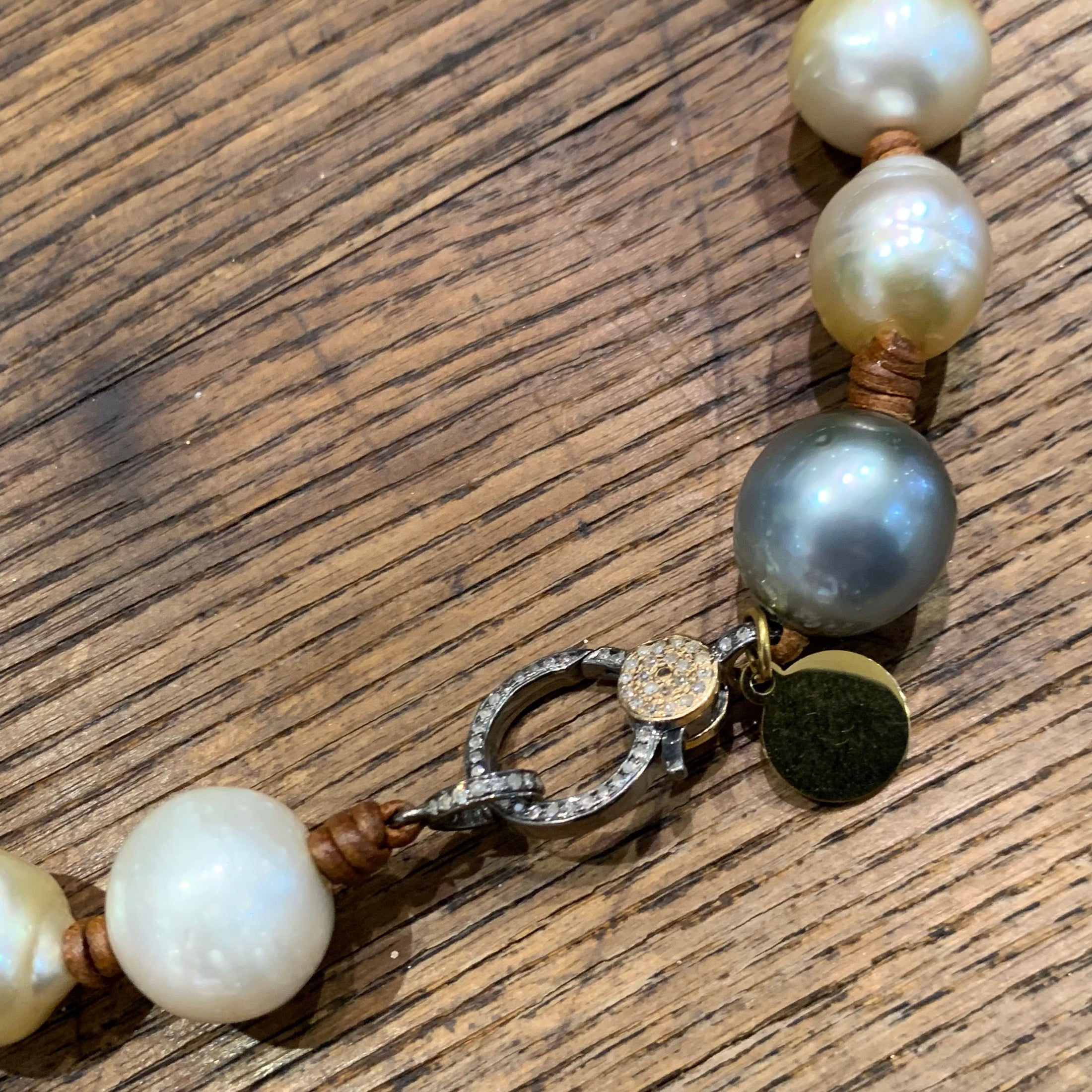 Discover refined luxury in this 17" choker, where a harmonious blend of South Sea and Tahitian pearls rests against warm whiskey leather. Gold diamond roundels punctuate the design, while a mixed-metal pavé diamond clasp and loop in gold and silver deliver polished sophistication and secure elegance.
