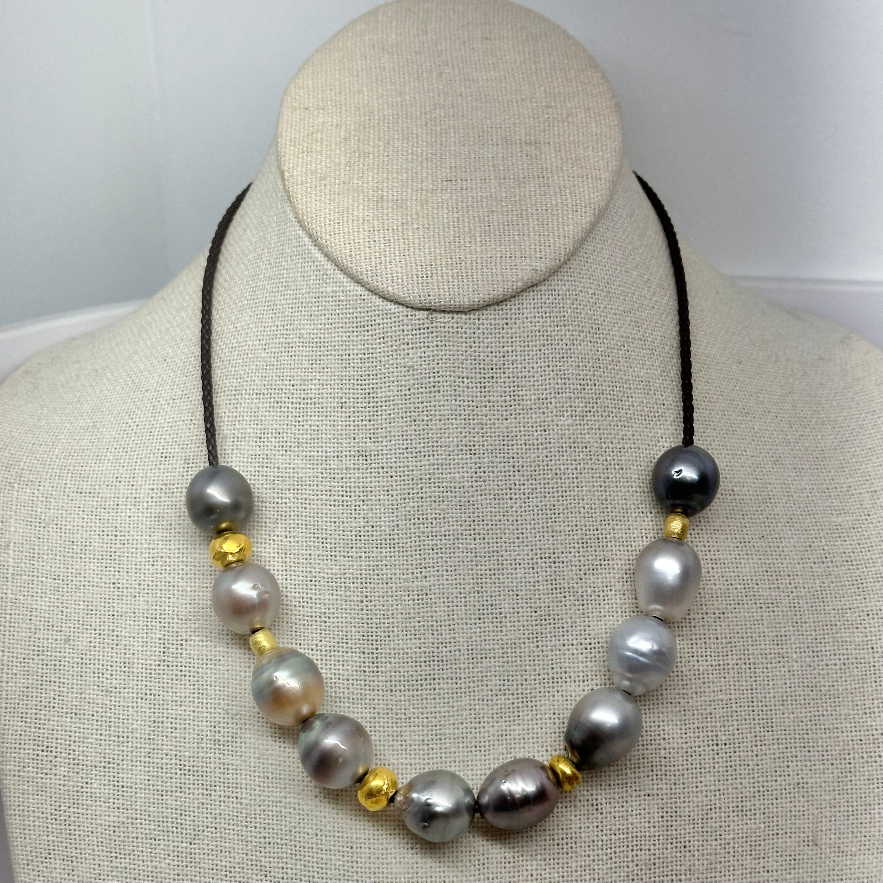 18” Choker with Tahitian Pearls and 18K Gold Roundels on premium braided leather.