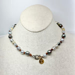 A mixture of Keishi, South Sea, and Tahitian pearls string on whiskey leather with silver and gold pave diamond clasp.