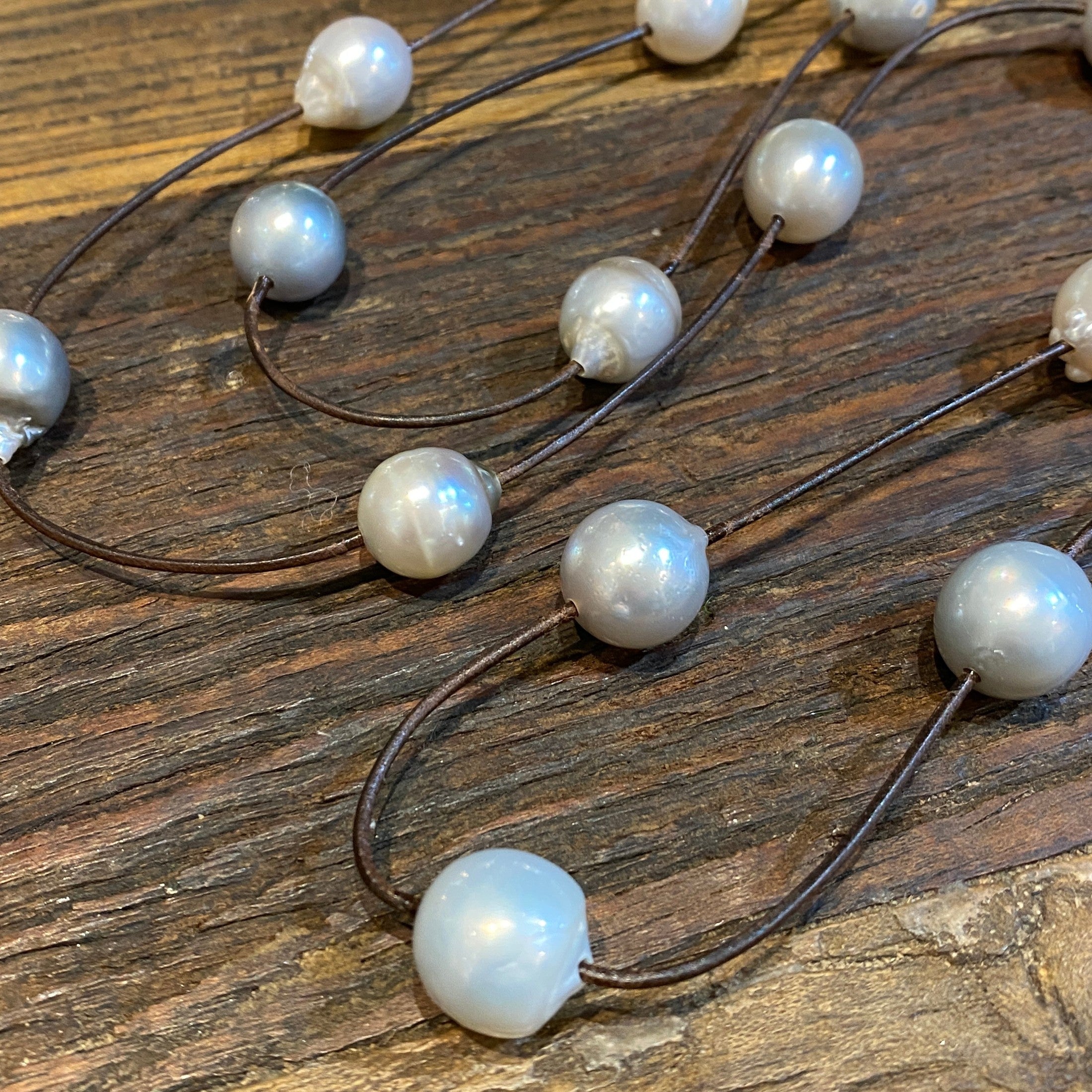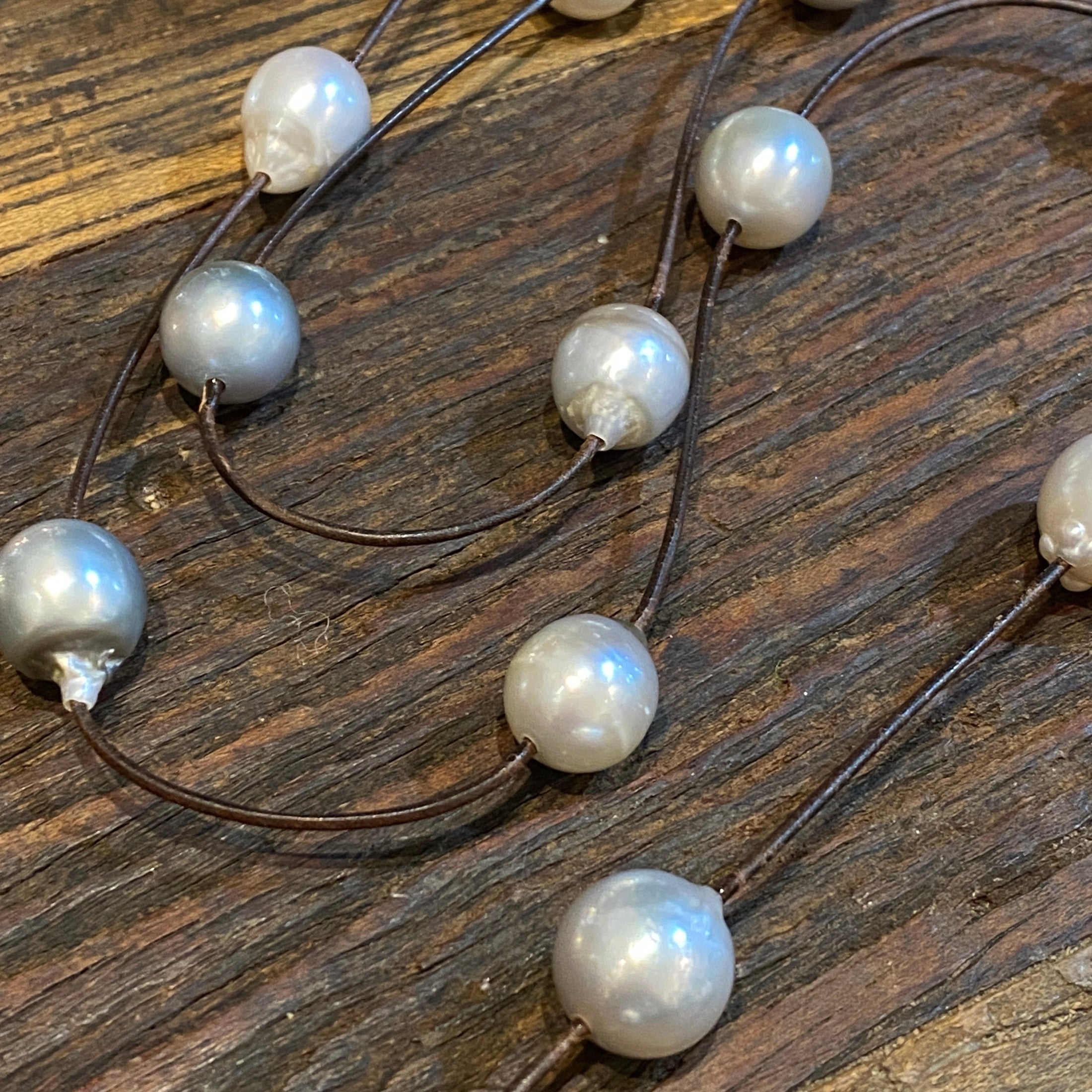 South Sea Pearls on dark brown leather, 44”. Can be worn shorter by pushing pearls through leather slip knot. Can be wrapped around 2/3 times.