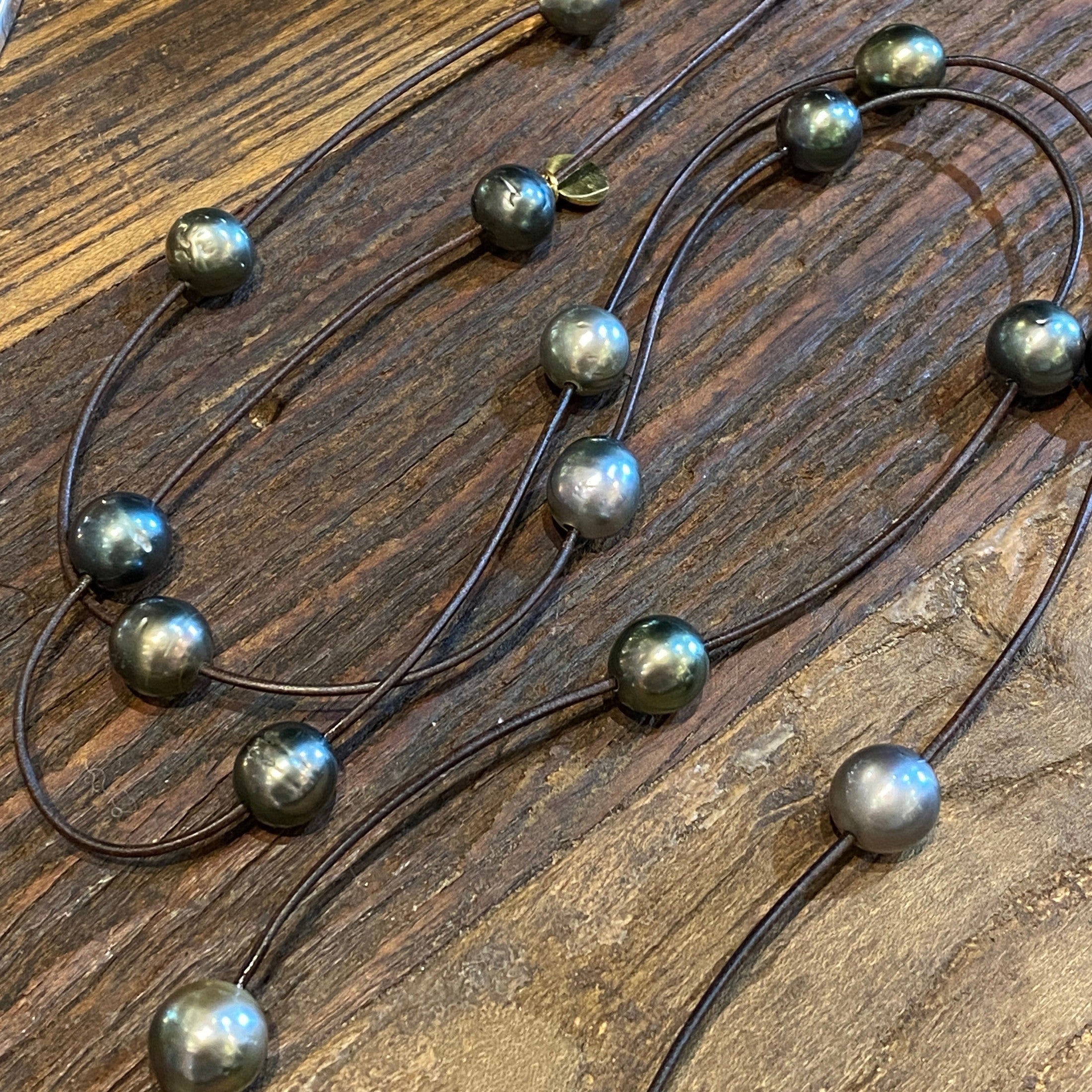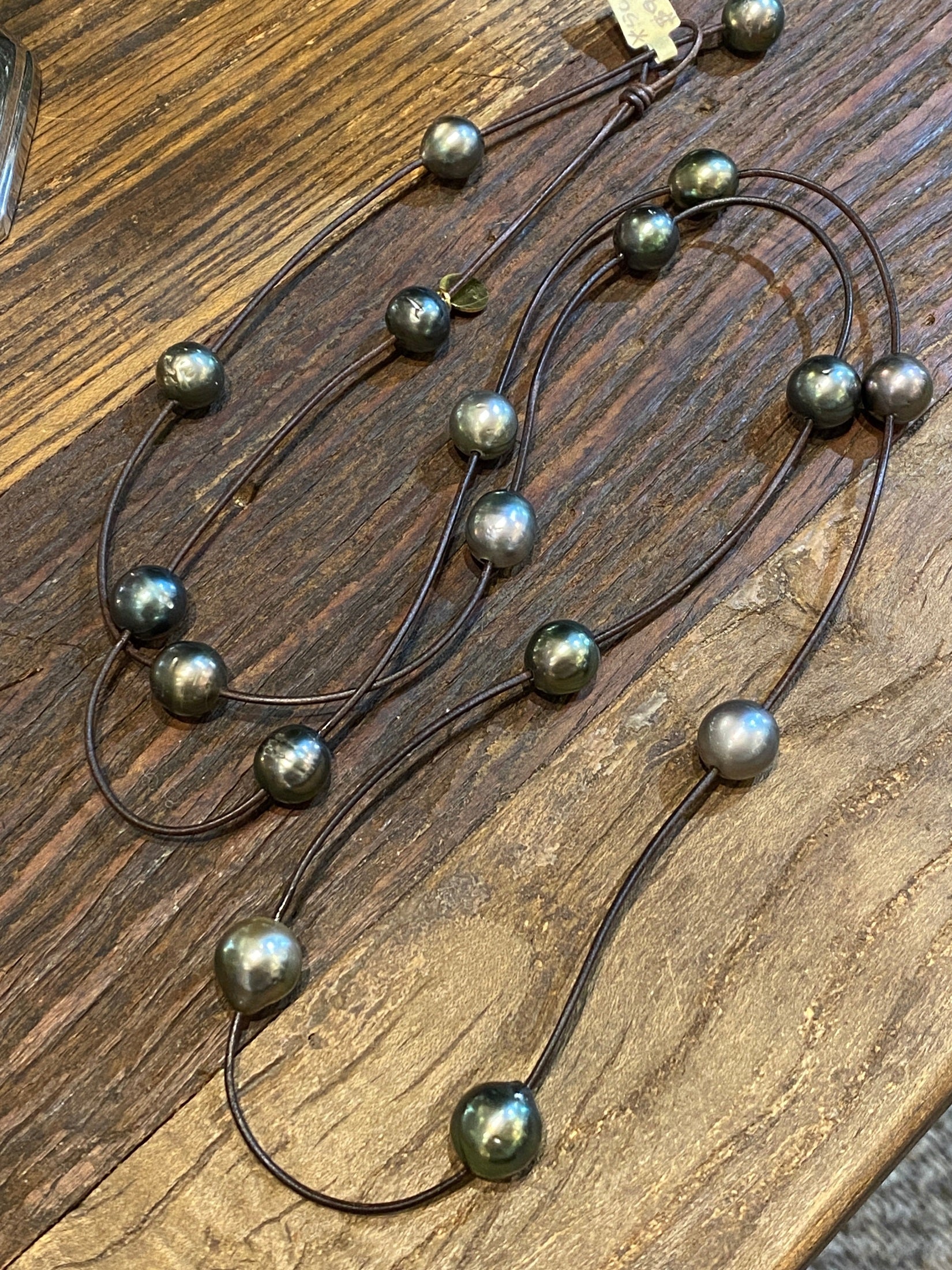 One of a kind piece, Tahitian Pearls on leather, 51”. Can be worn shorter by pushing pearls through leather slip knot. Can be wrapped around 2/3 times.