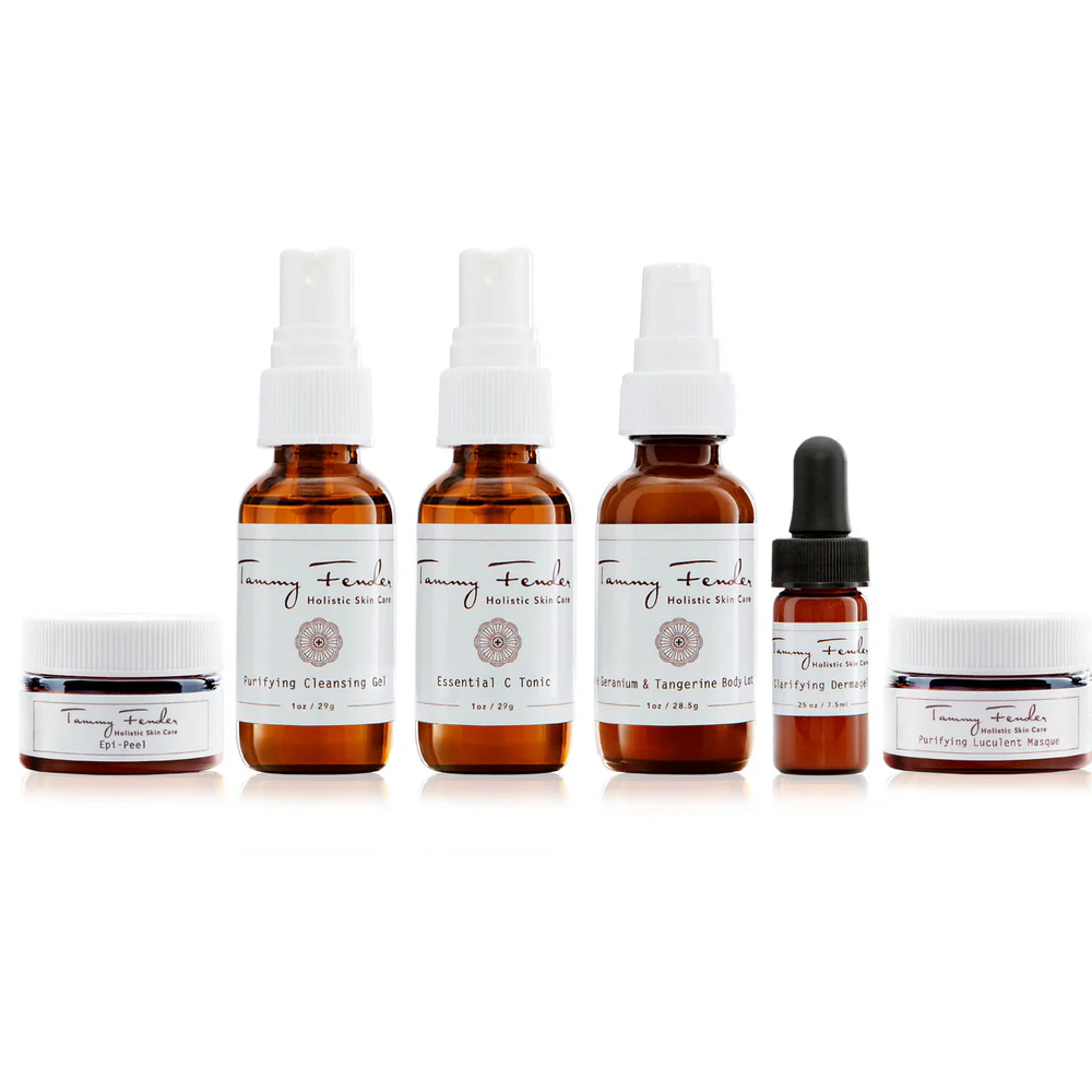 At the core of this detoxifying at-home facial kit are two powerhouse cleansing masks—Epi-Peel, our micro-exfoliating peel with Spearmint and Rosemary, and Purifying Luculent Masque, an Illite clay-based treatment mask infused with a rich array of herbal remedies, including Fo-Ti and Great Burdock, both celebrated as great detoxifiers in traditional herbalism.