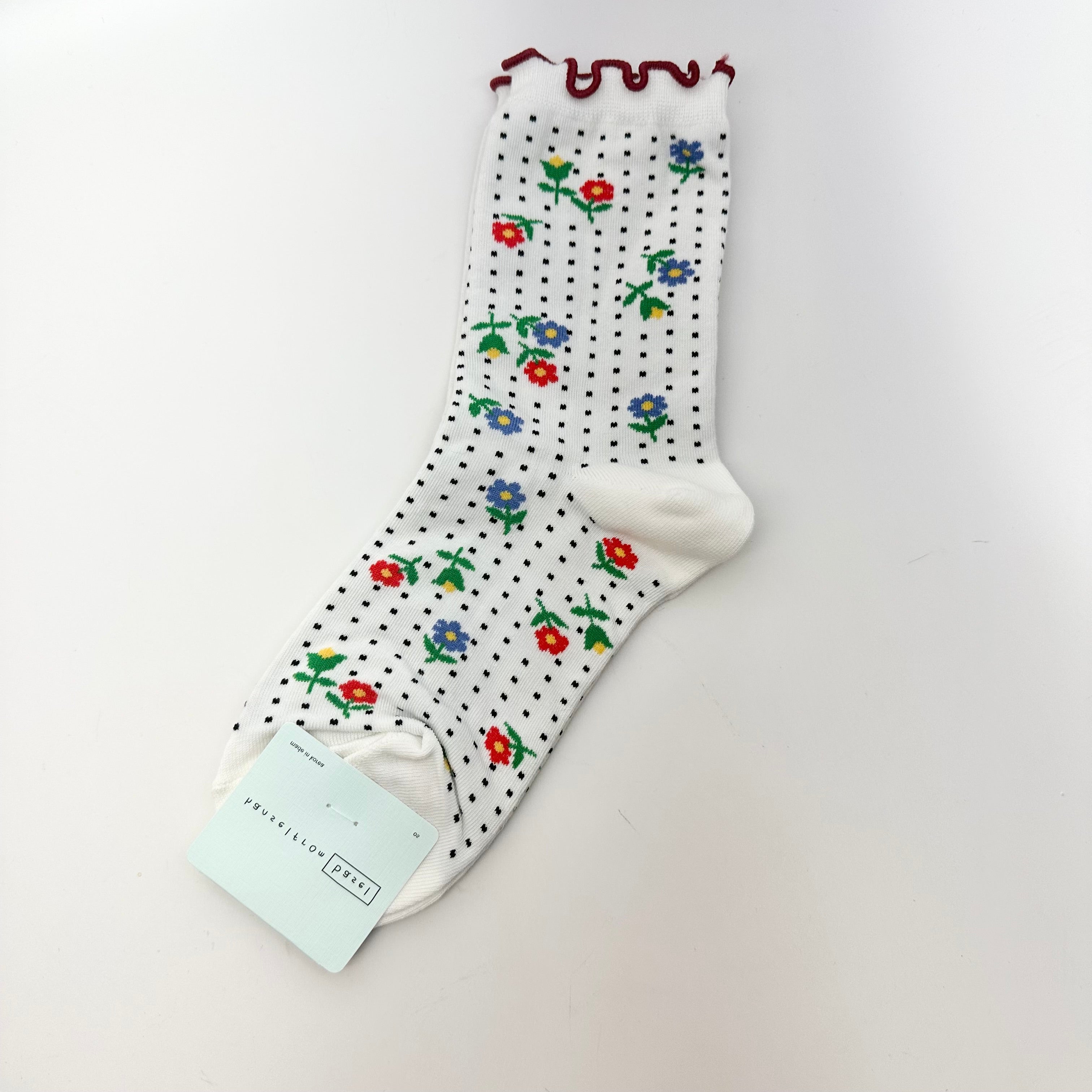 Get ready to be in full bloom with the Dottie Floral Crew. This stylish top features sweet cotton florals that pop against the dotted body. With a unique contrast stitched lettuce cuff, you'll be serving looks all day long!
