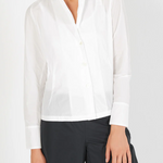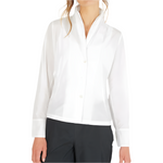 The voluminous shawl collar is striking. This blouse also looks particularly beautiful worn under a blazer when the stand-up collar is highlighted.