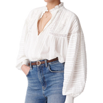 The vintage-look Dahlia cotton-blend blouse stands out for its meticulous, neat details. Featuring a range of pleating techniques, embroidery, gathers and lace, this piece is already a wardrobe favourite. Its cropped, trapeze cut creates a dainty, airy, foamy look. The added extra? The smocked, elasticated style of the sleeves let you play with the silhouette and the volume of these puffed sleeves.