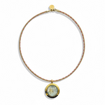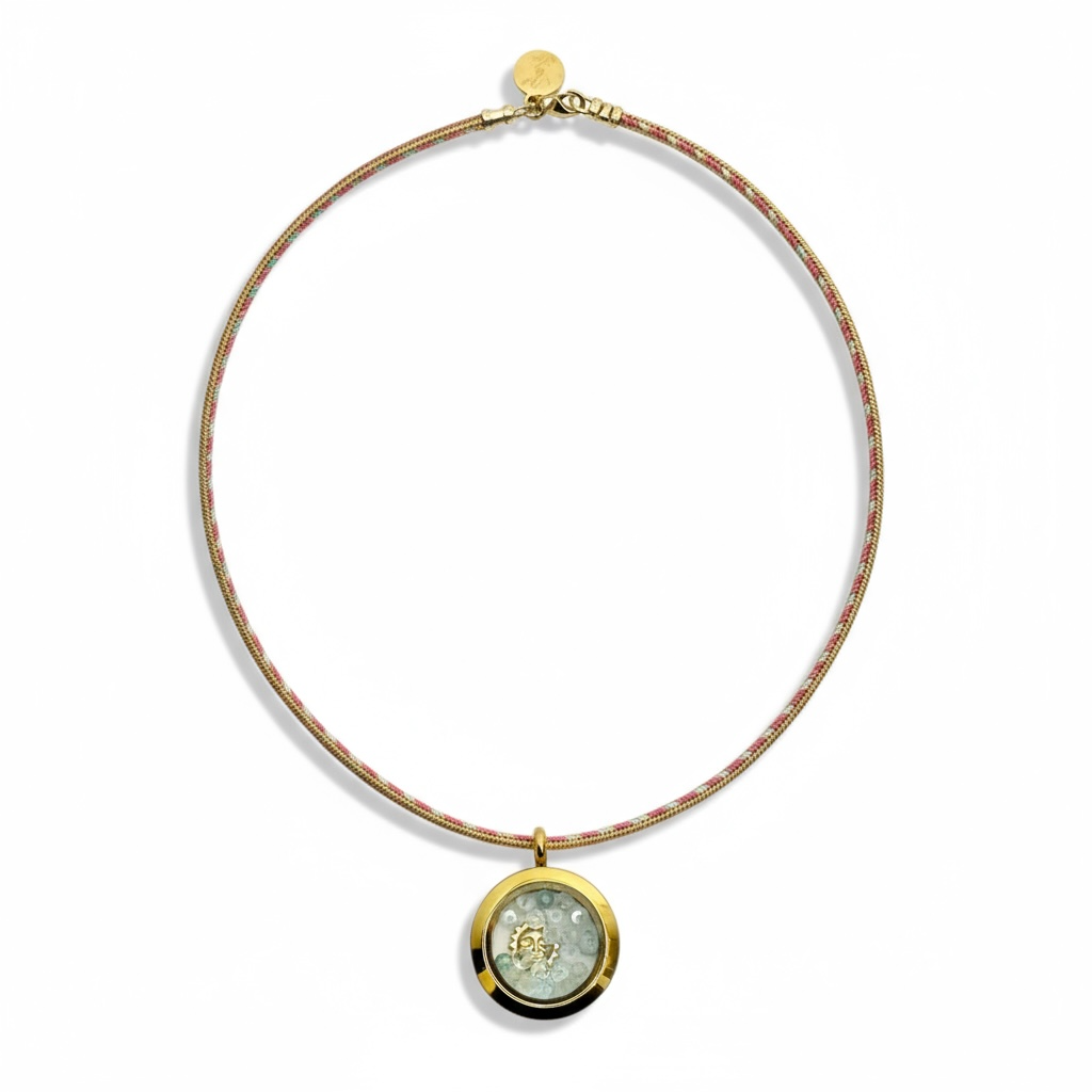 This elegant choker features a delicate gold-plated locket adorned with a radiant sun face and accents of blue semi-precious stones. The locket opens gracefully to reveal its treasured charm, while the refined metallic cord provides a polished foundation. Perfectly proportioned at 16.5 inches, it strikes a balance between statement-making and wearable sophistication.