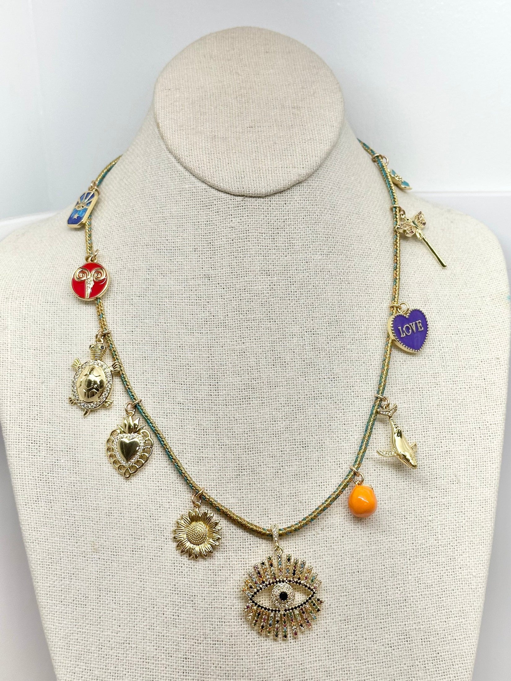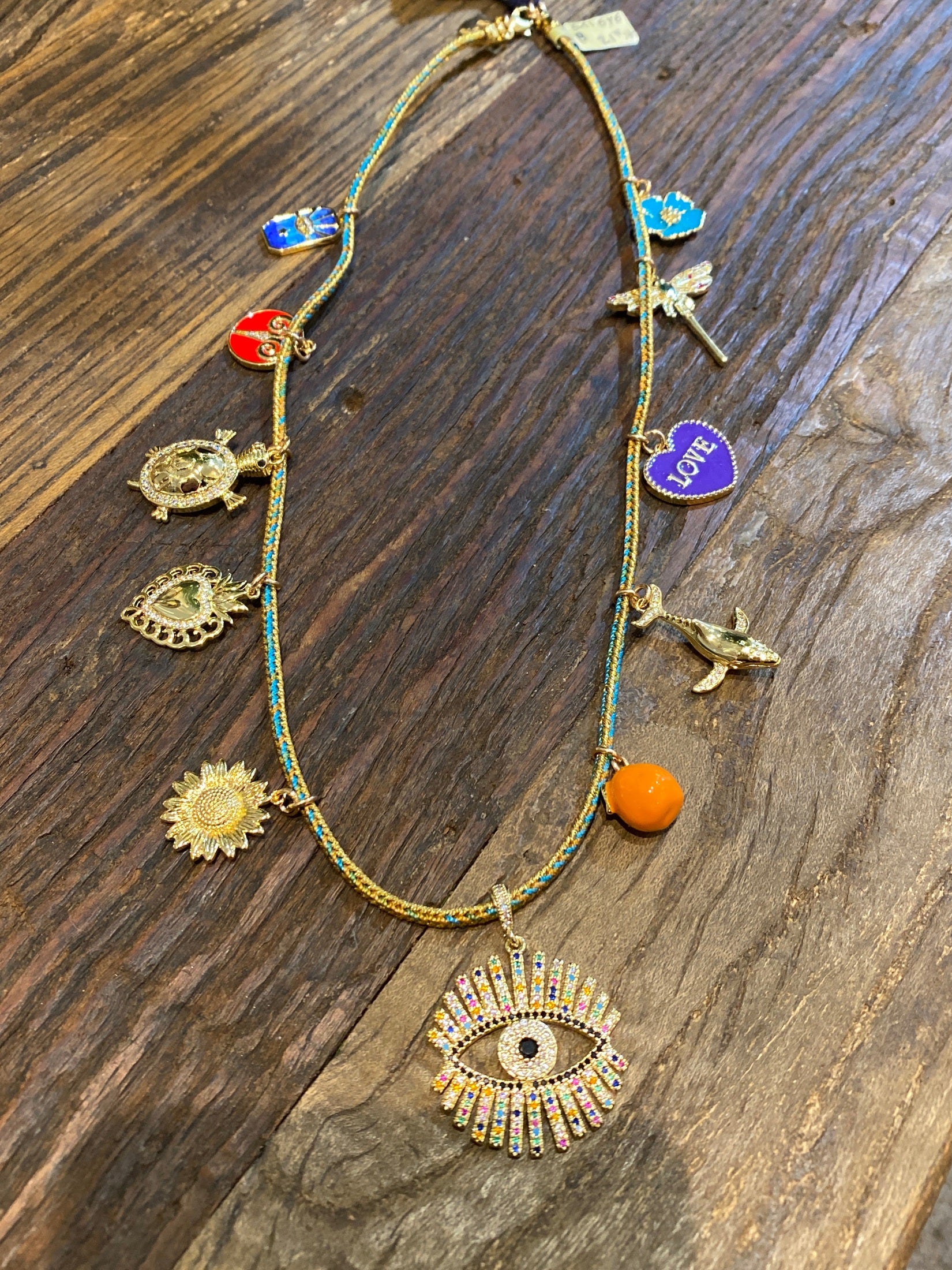 21” charm necklace w/ Evil Eye Pendant on multicolored metallic cord.
