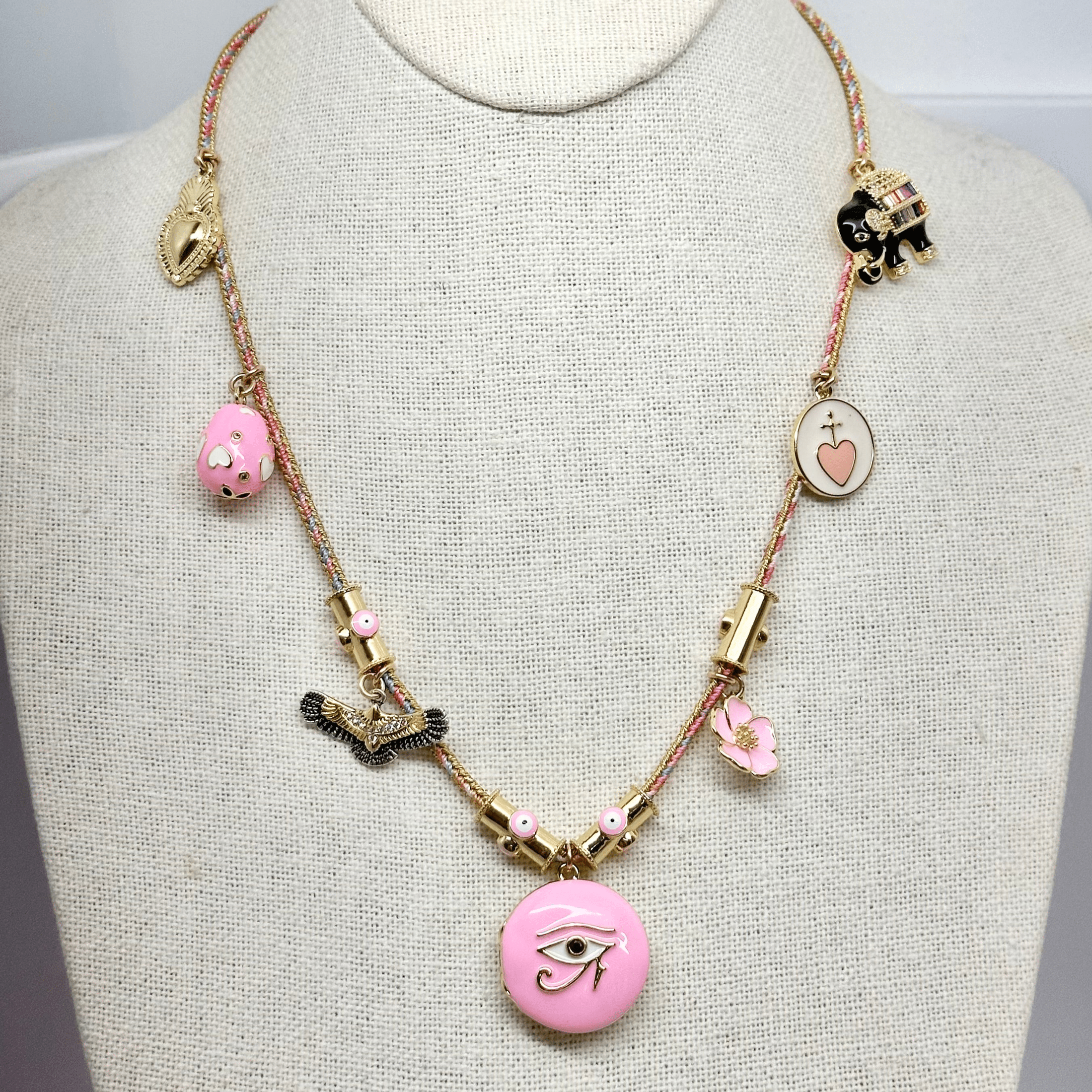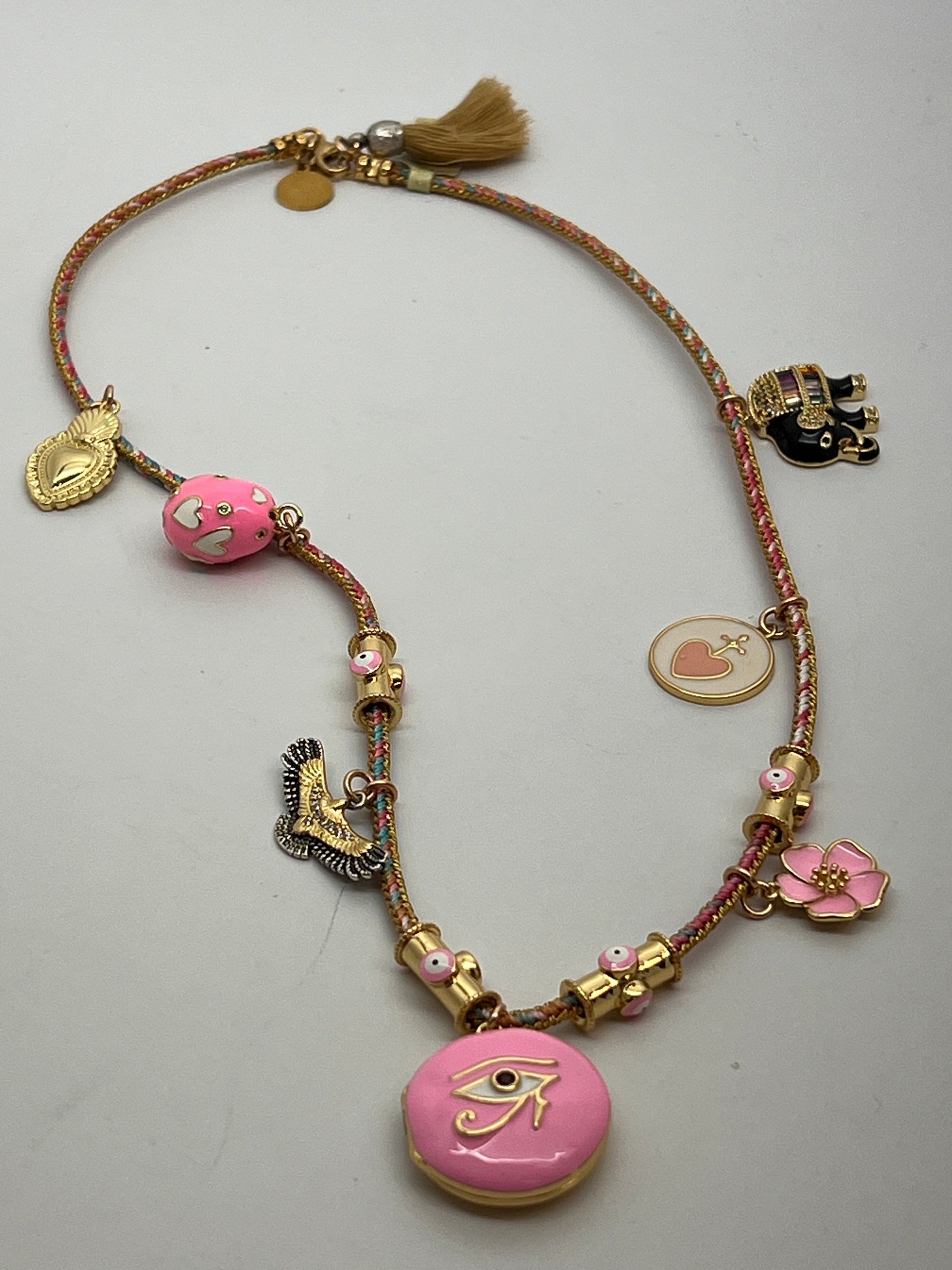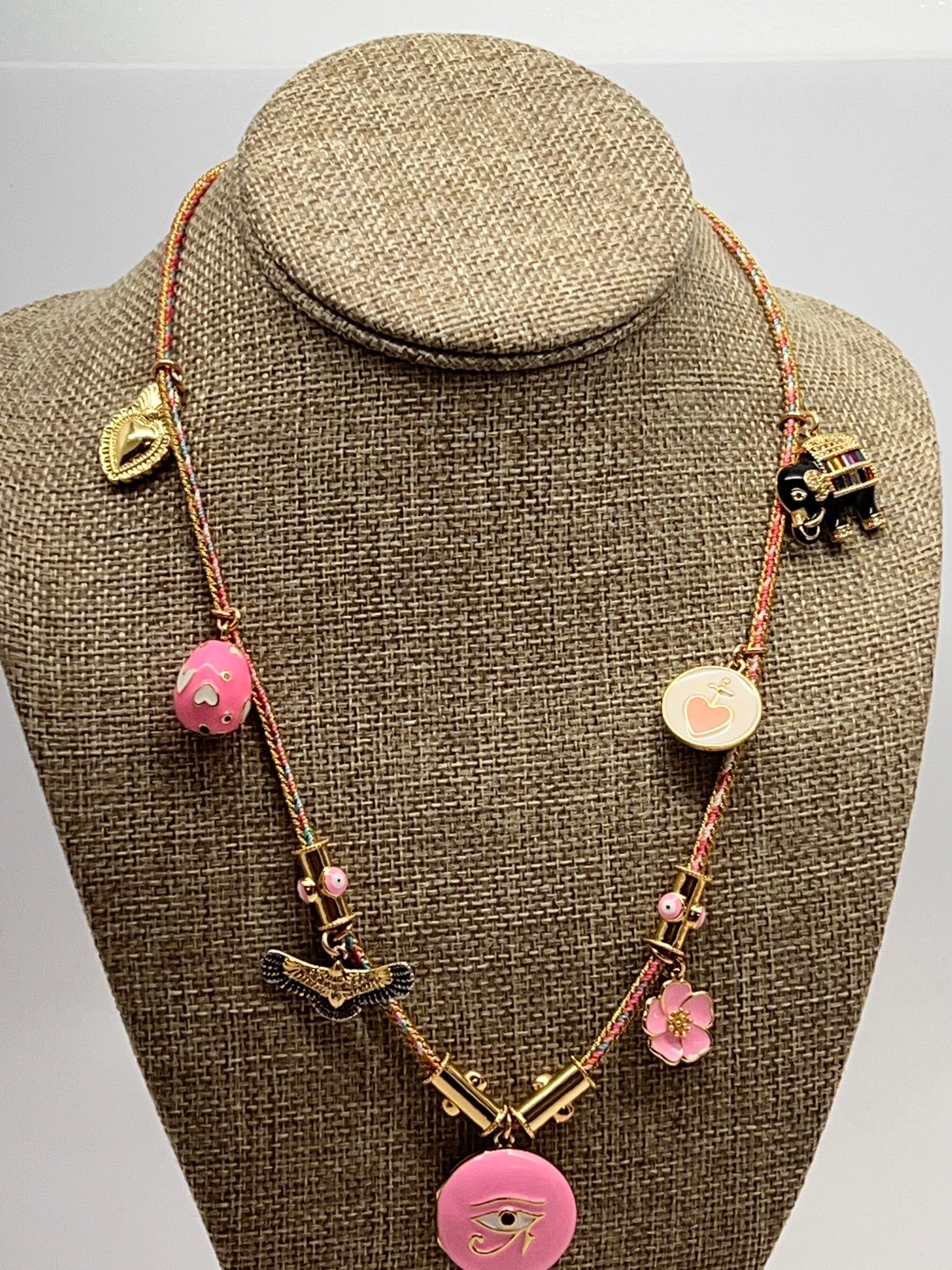 21” charm necklace w/ Evil Eye Pendant on multicolored metallic cord.