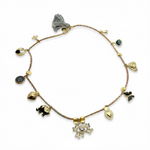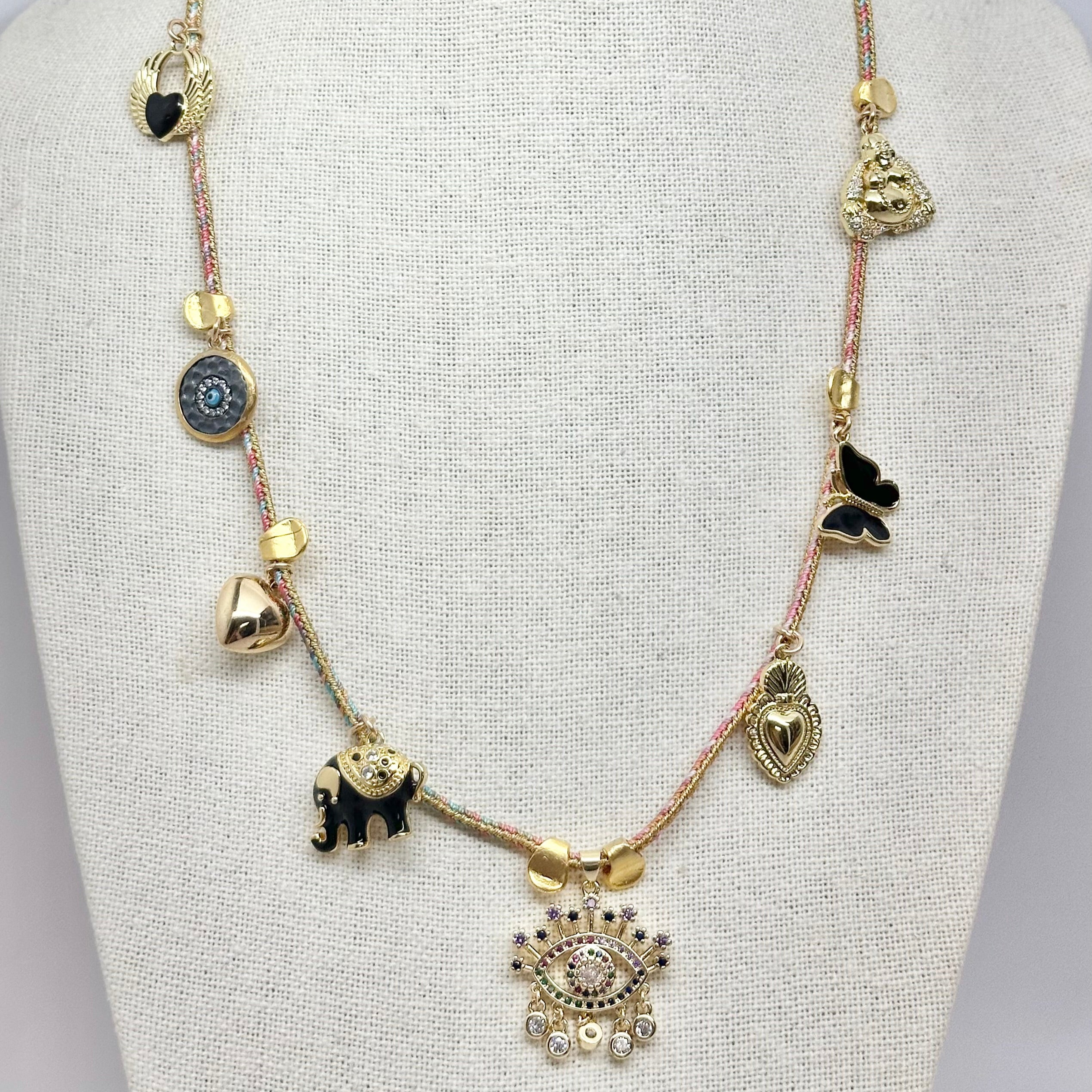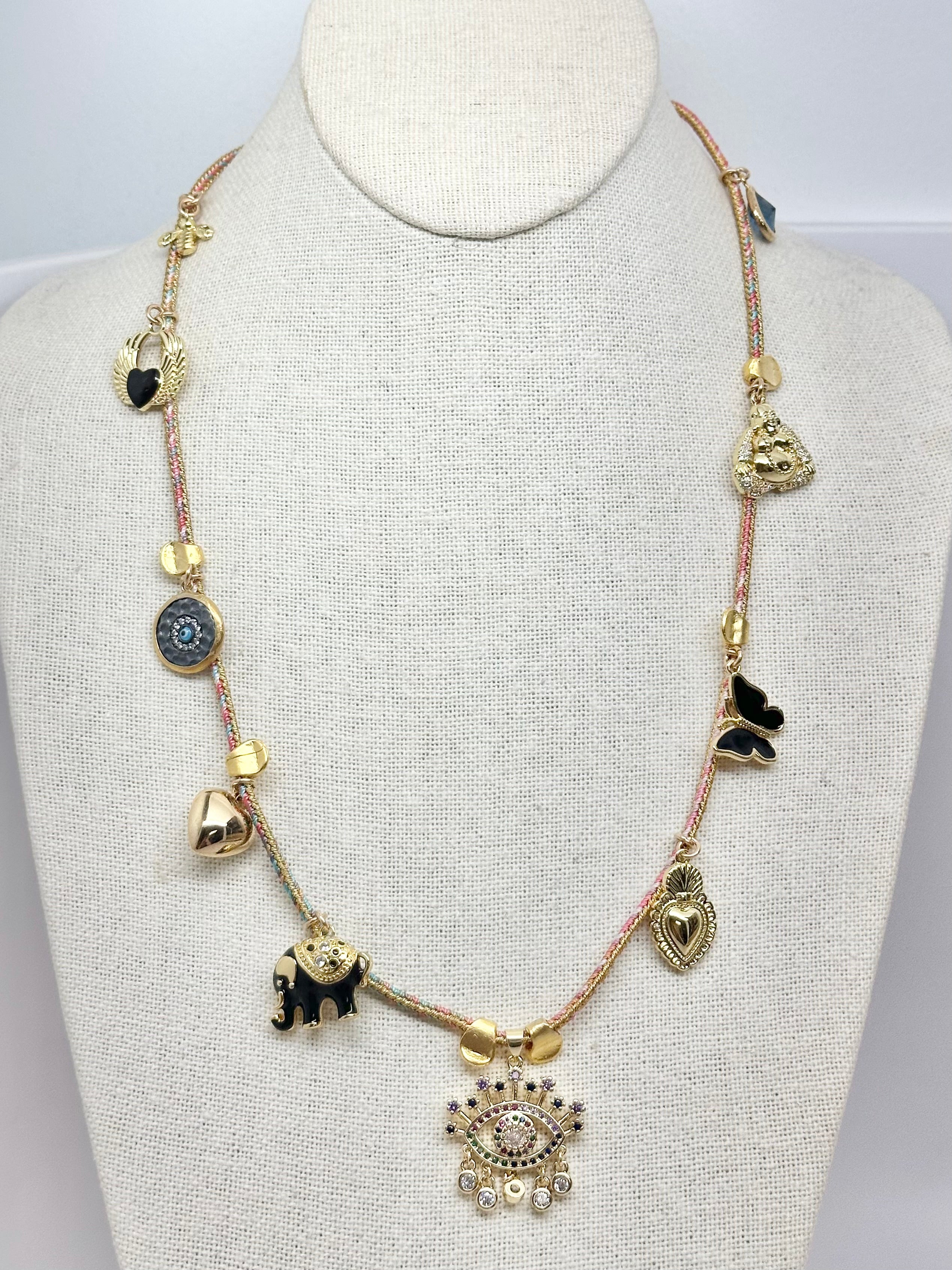 24” charm necklace w/ Evil Eye Pendant on multicolored metallic cord.