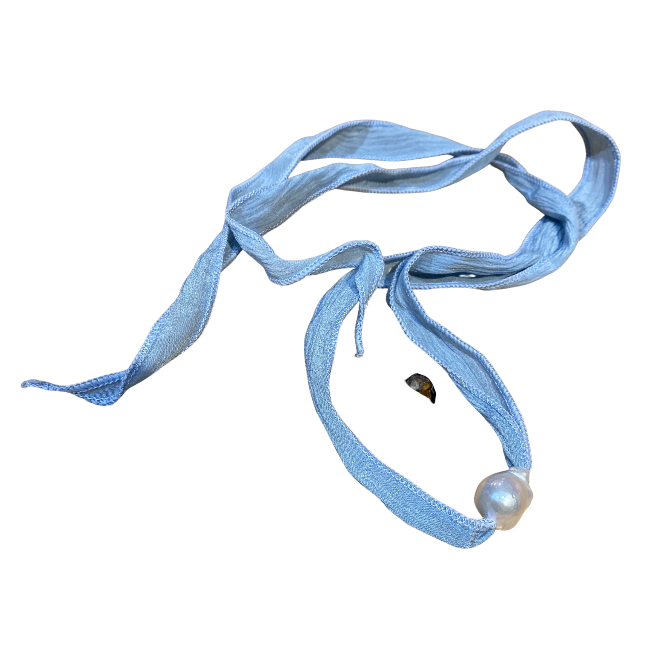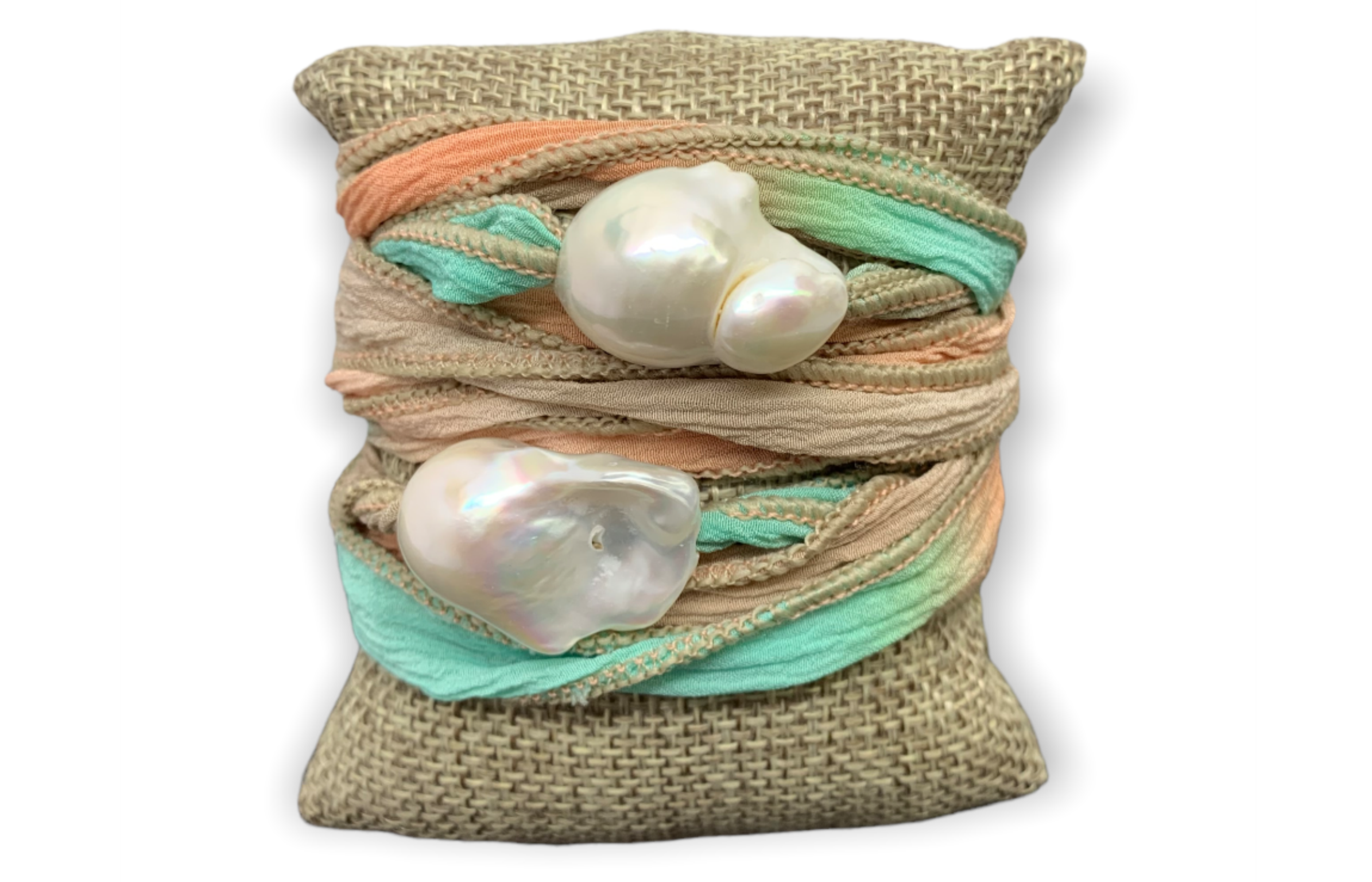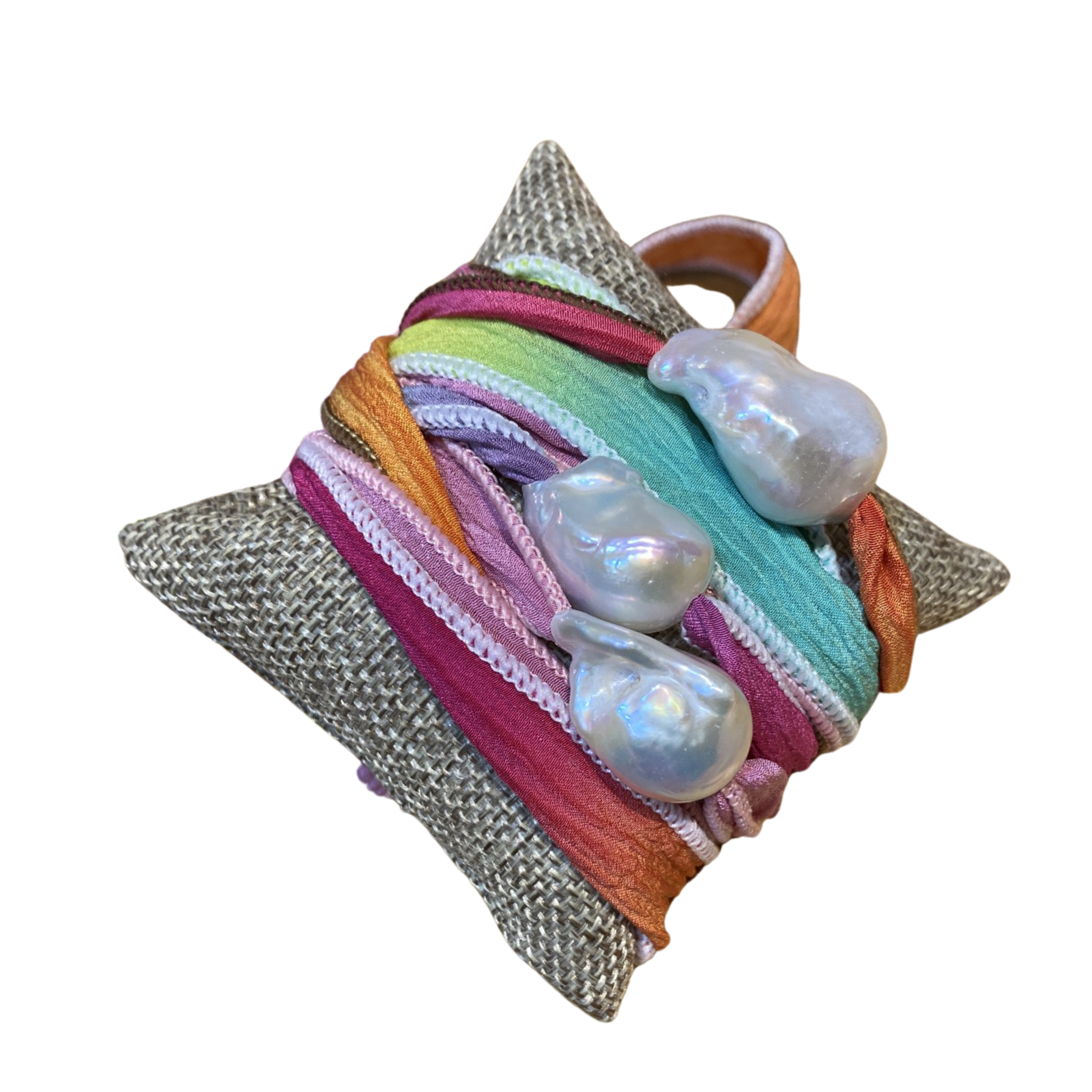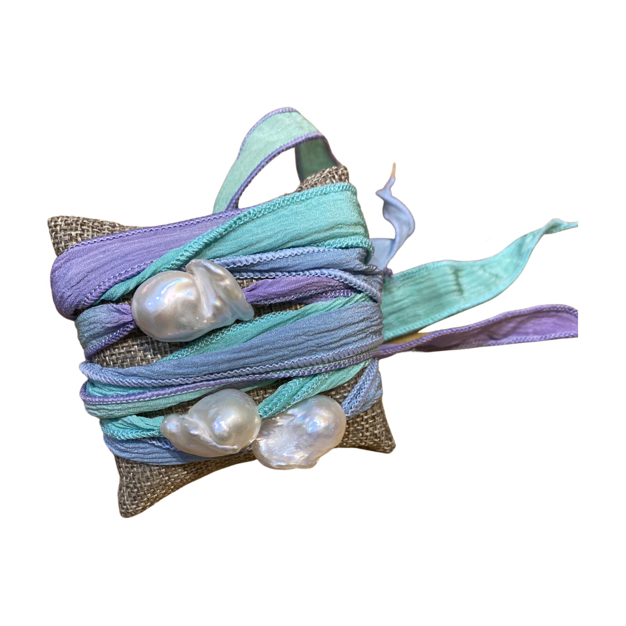 A fun wrap bracelet or necklace ... what ever you choose to make of it . Multi colored ribbon with a large baroque freshwater pearl.
