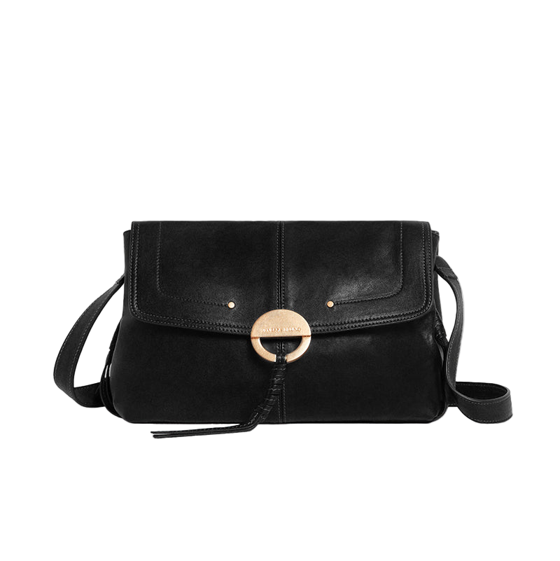 Adjustable leather strap with a gold buckle for shoulder and crossbody wear.