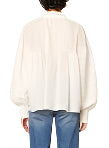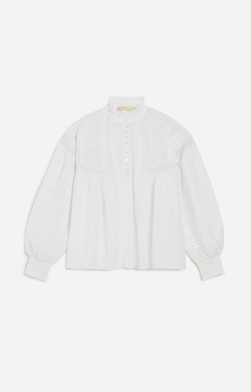 The vintage-look Dahlia cotton-blend blouse stands out for its meticulous, neat details. Featuring a range of pleating techniques, embroidery, gathers and lace, this piece is already a wardrobe favourite. Its cropped, trapeze cut creates a dainty, airy, foamy look. The added extra? The smocked, elasticated style of the sleeves let you play with the silhouette and the volume of these puffed sleeves.