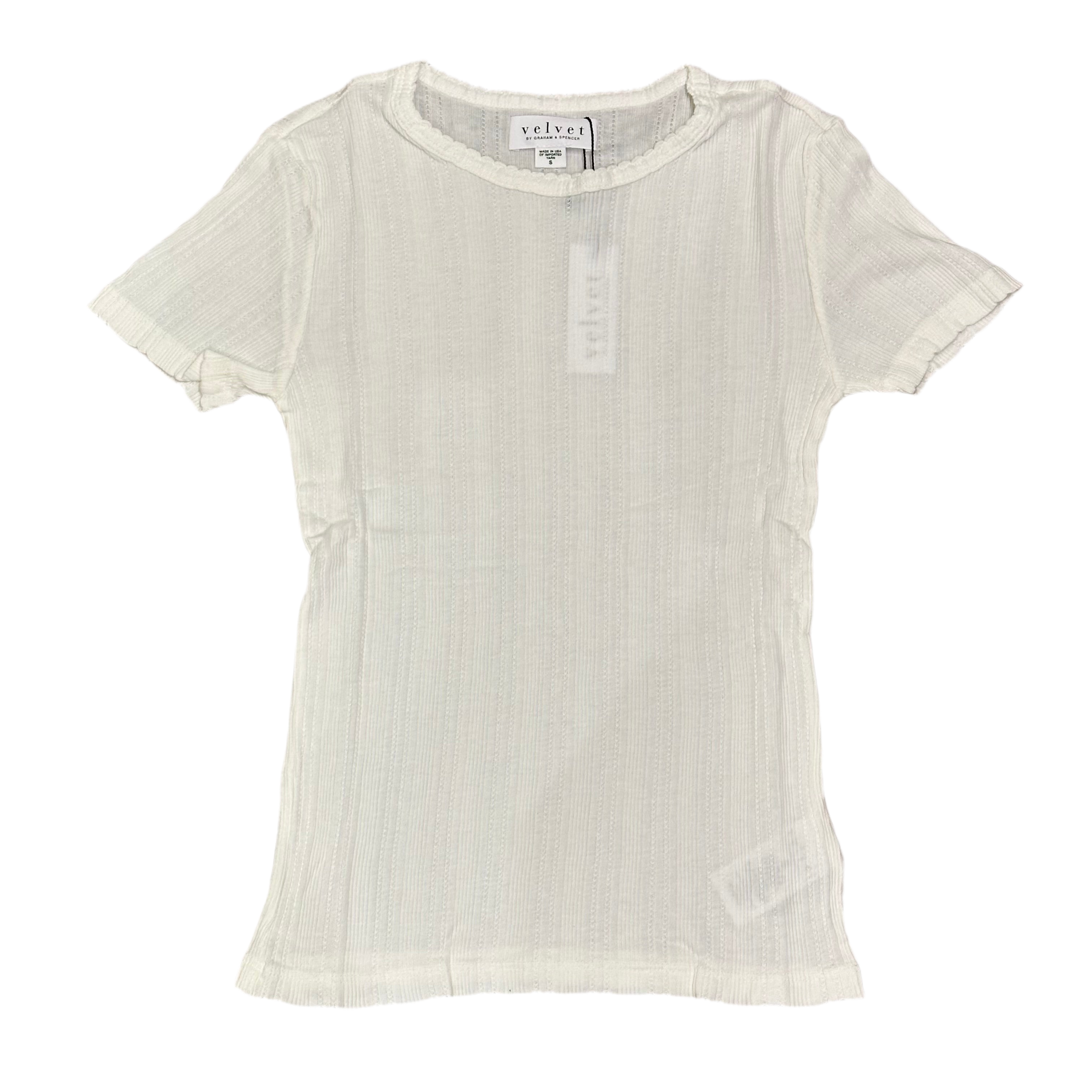 Crafted from a soft cotton-modal blend, this fitted tee features delicate ribbed pointelle details for subtle texture. The crew neckline is accented with a scalloped edge, complementing the short sleeves for a refined everyday look.