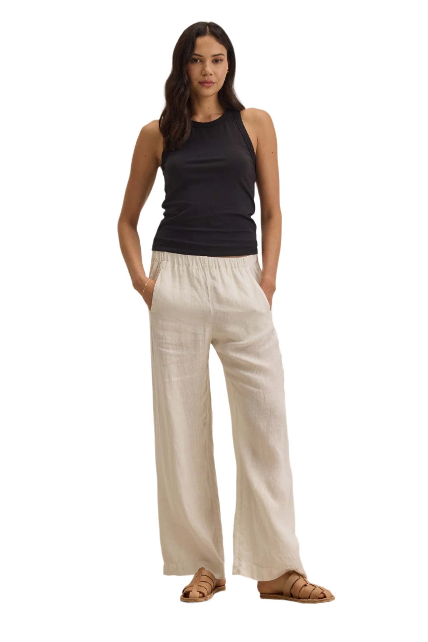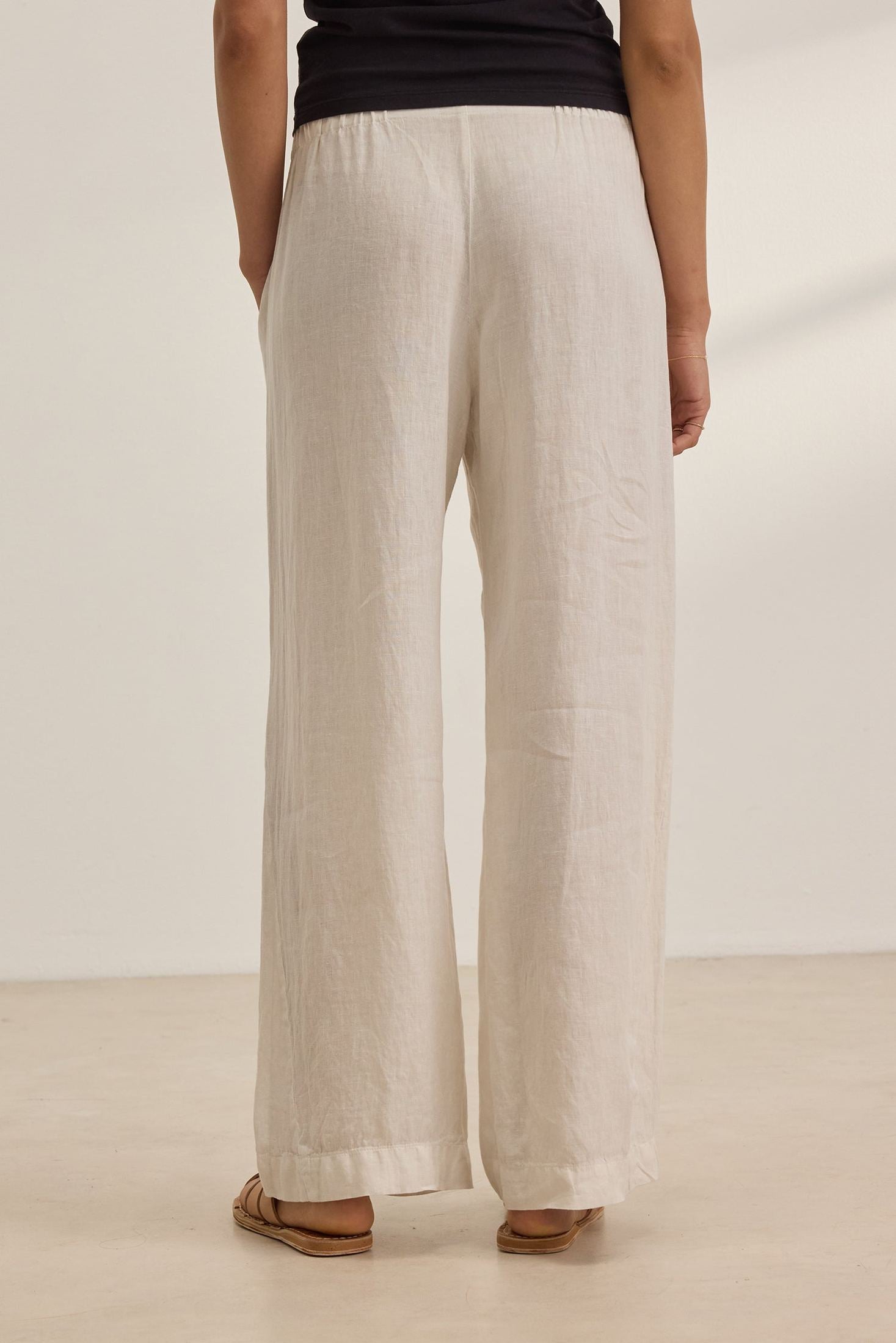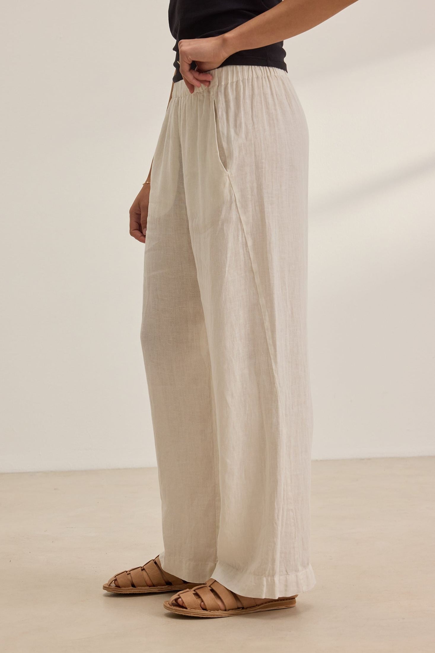 Crafted from lightweight woven linen, these full-length pants offer an easy, relaxed fit. The elastic waist ensures comfort, while the wide-leg design creates a flattering, effortless silhouette. Slash pockets add practicality, making these perfect for warm weather or relaxed styling.