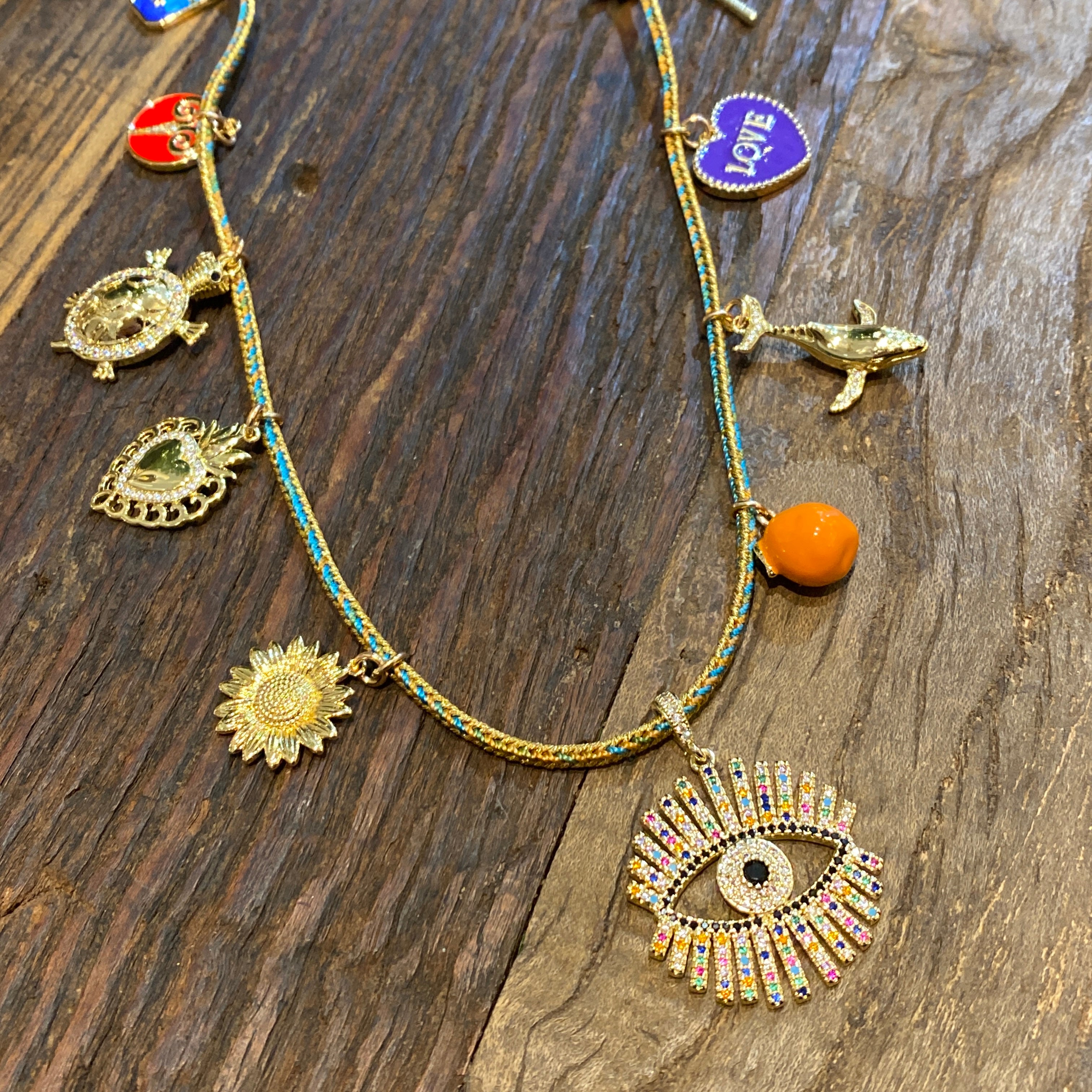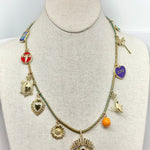 21” charm necklace w/ Evil Eye Pendant on multicolored metallic cord.