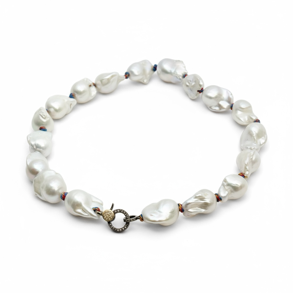 16" Choker with medium sized Baroque Freshwater Pearls with Silver Pave Diamond clasp & loop on multi-color thread/cord.