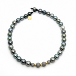 Beautiful black Tahitian Pearls with 2 small & 2 medium Silver Pave Diamond Rondels and 3 18K Gold Rondels on leather.