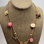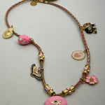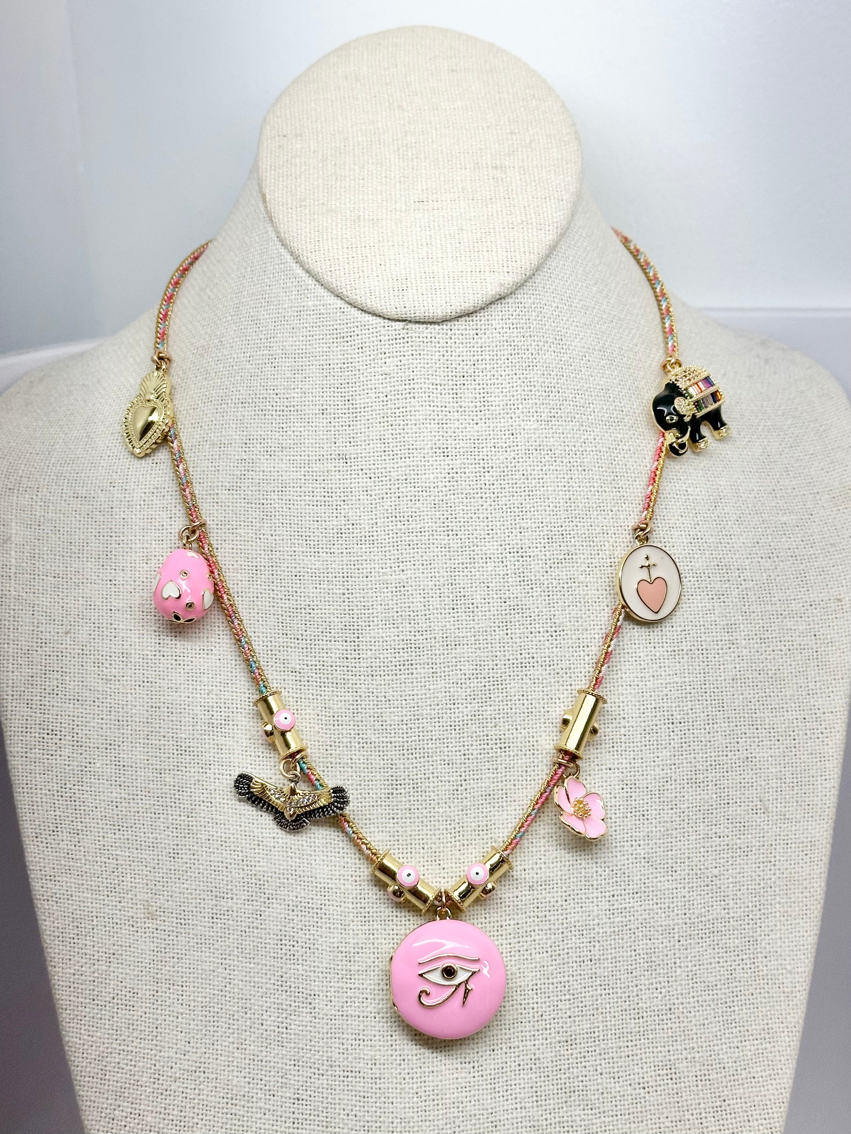 21” charm necklace w/ Evil Eye Pendant on multicolored metallic cord.