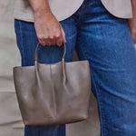 Small tote bag with an essential and timeless design defined by the sinuosity of the vegetable tanned leather stopped by soft pleats. Adjustable shoulder strap with cufflink. Pleats stopped with hand-sewn t-shirts. Snap button closure, Suede lining. 100% made in Italy.