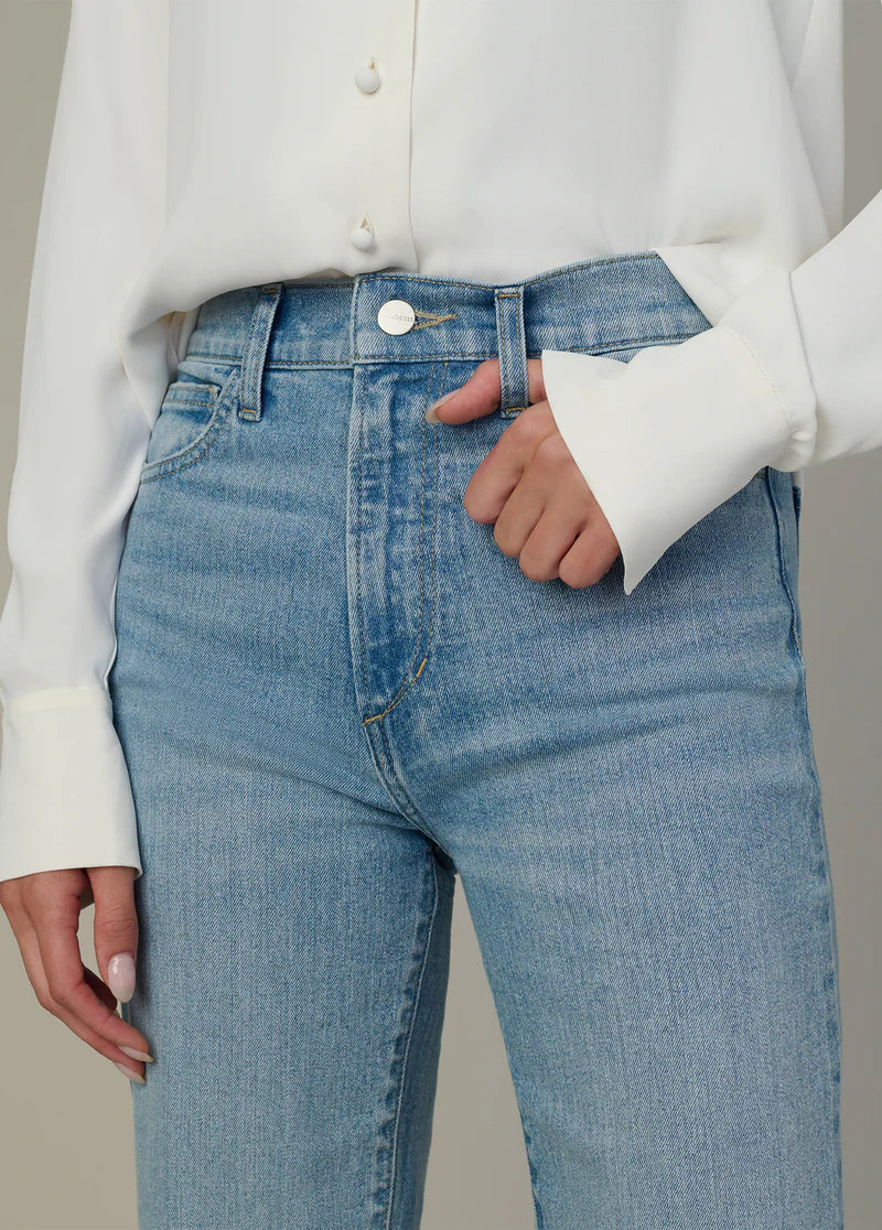 A high rise and slim fit through the waist and hip with a modest wide leg that hits above the ankle.