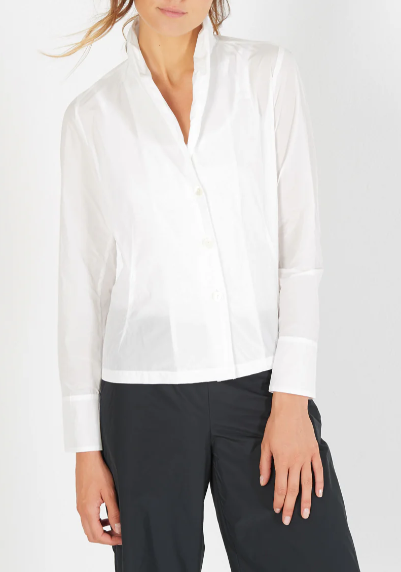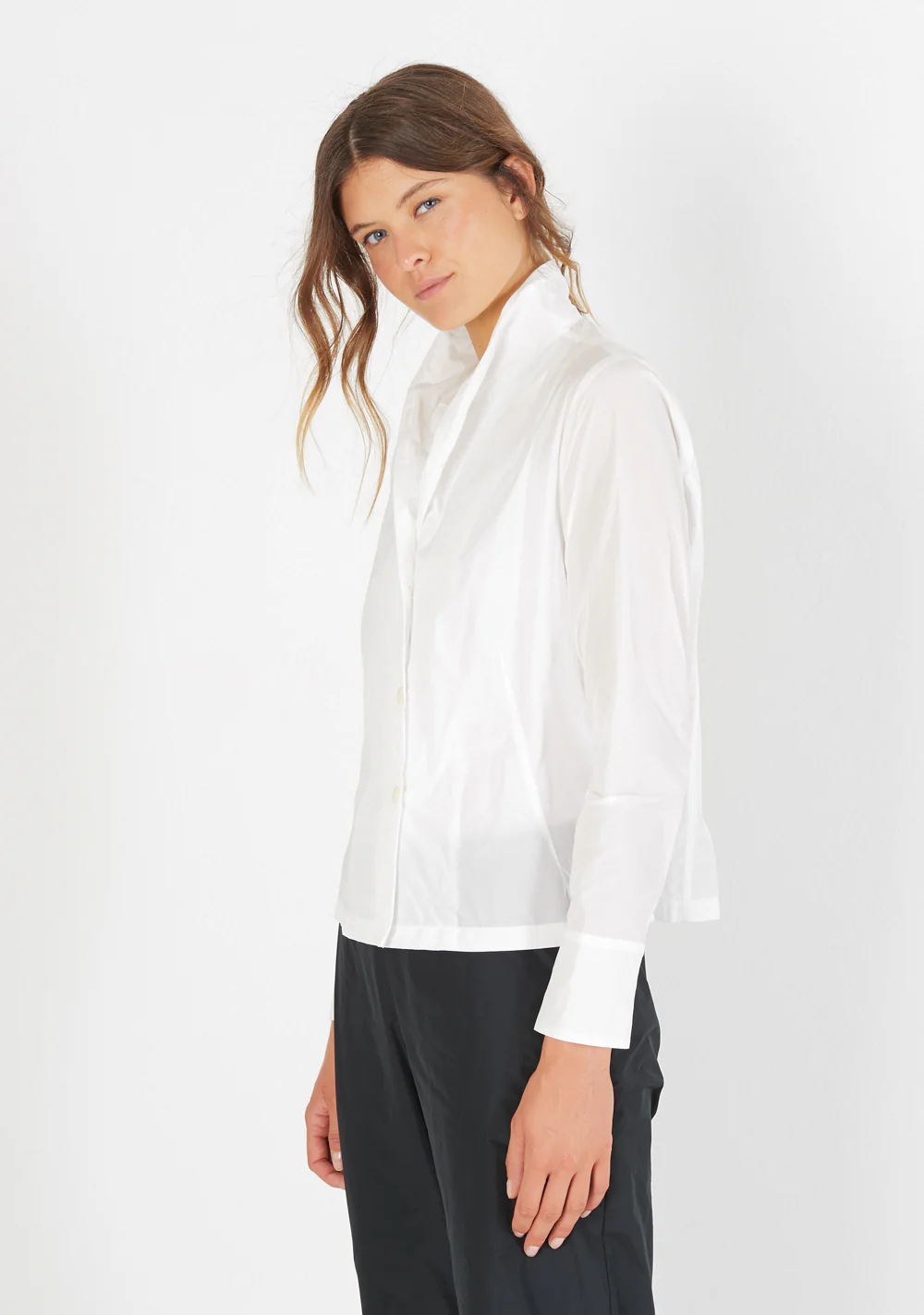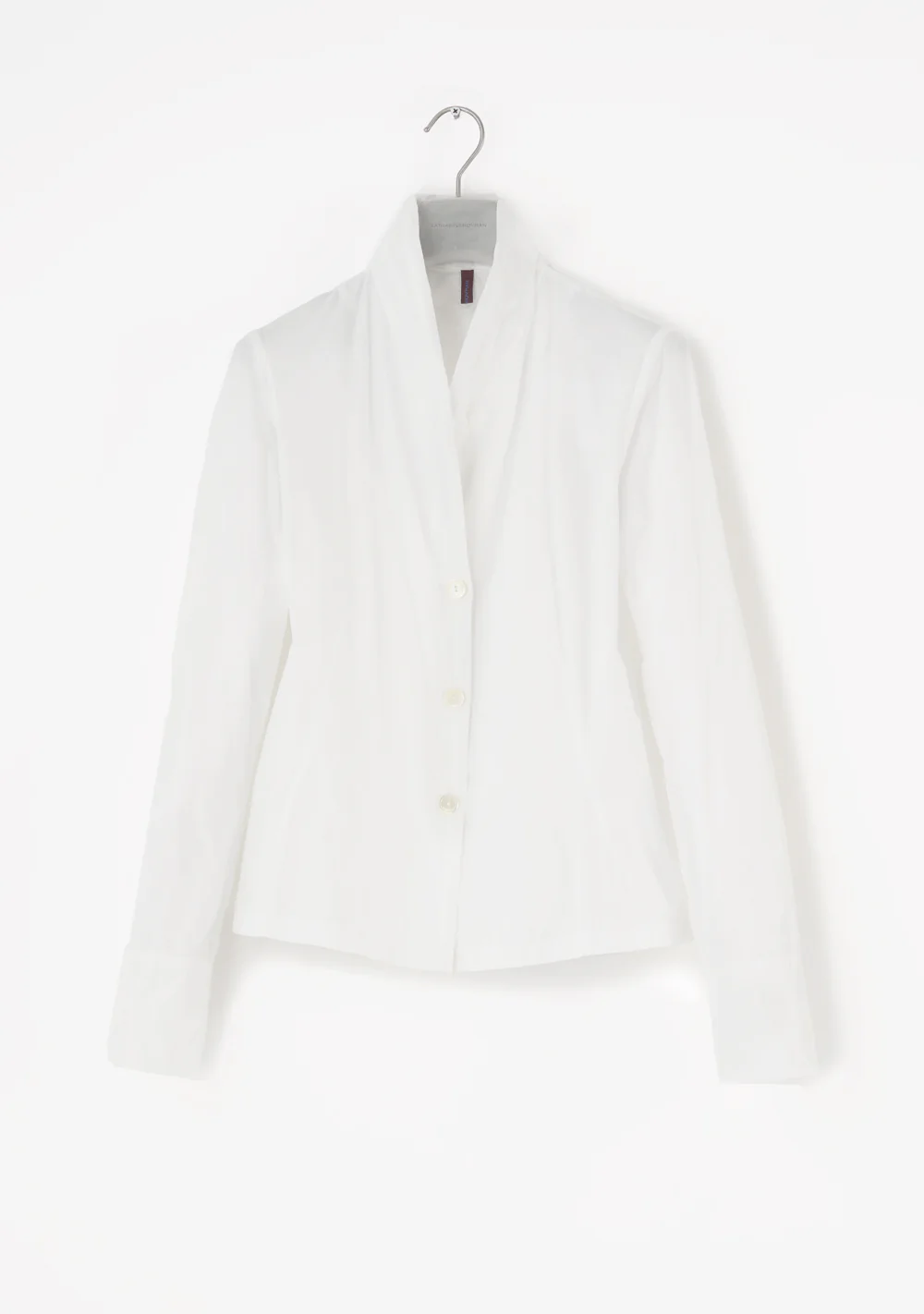 The voluminous shawl collar is striking. This blouse also looks particularly beautiful worn under a blazer when the stand-up collar is highlighted.