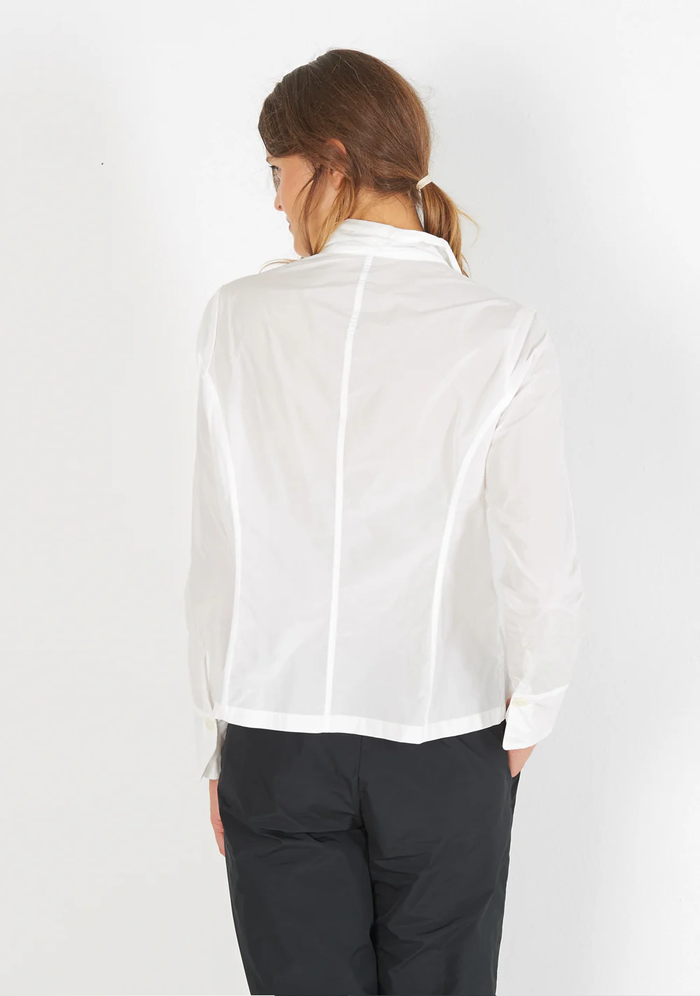 "Life with our taffeta blouse could not be more effortless. Folded featherweight finds space in the smallest bag, to unfold its full splendour at the destination. Casual, sporty, but also a subtle elegance and shine. Oh, and easy care!"