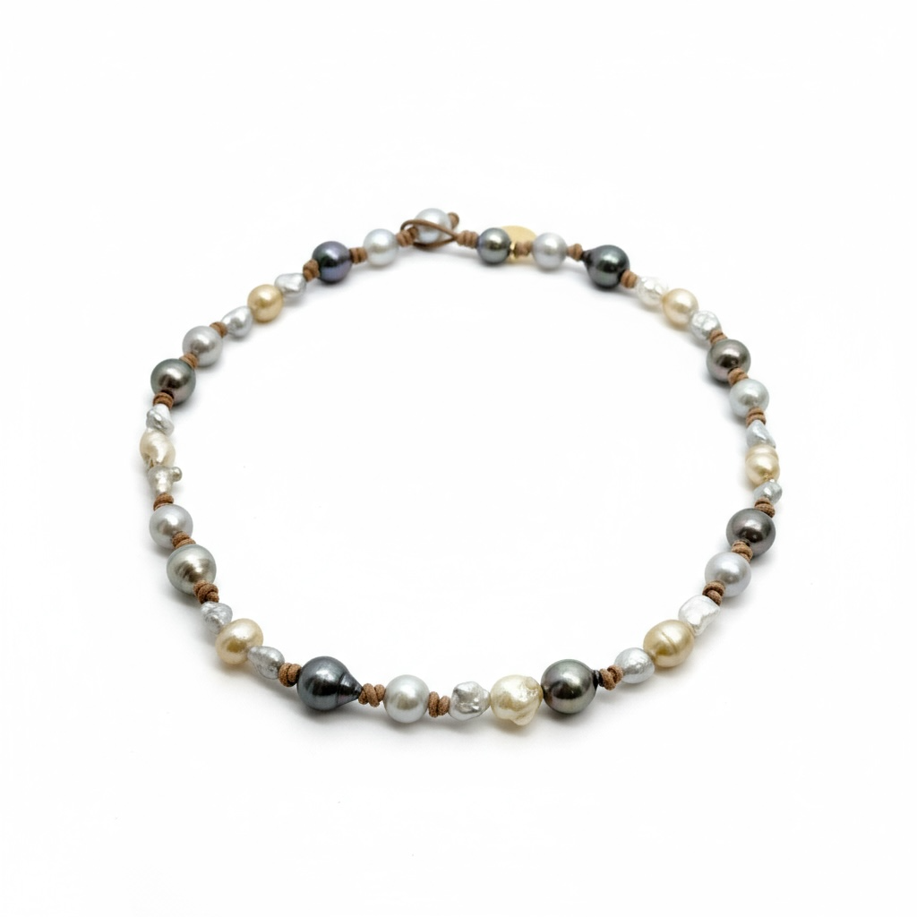 Lola's signature design showcases an exquisite blend of Keshi, South Sea, and Tahitian pearls gracefully arranged on warm tan leather or dark brown leather. At 16", this choker pairs seamlessly with other pieces from the collection, offering endless styling possibilities for the discerning wearer.