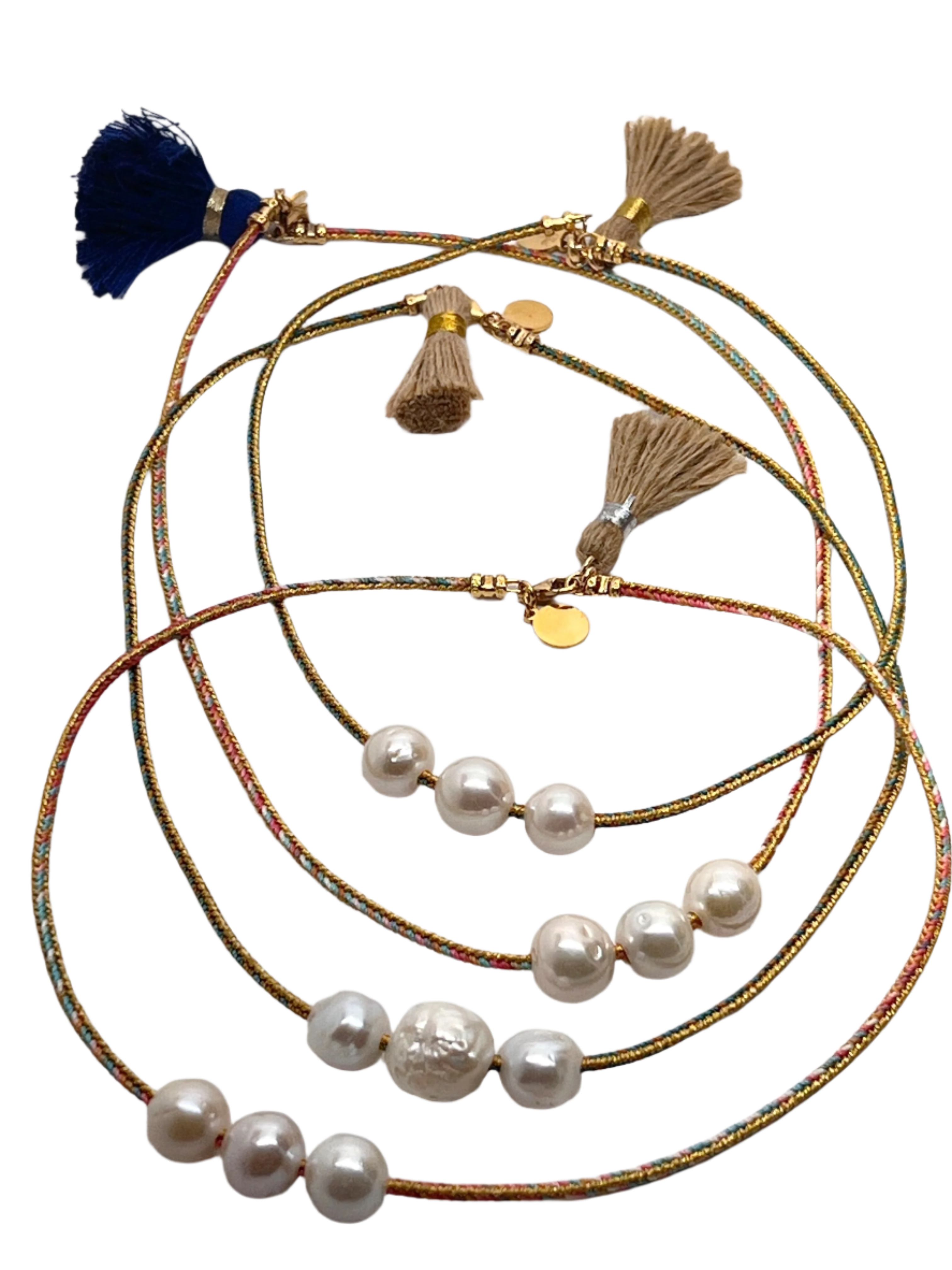 Multicolored metallic cord with 3 Edison Pearls and tassel.