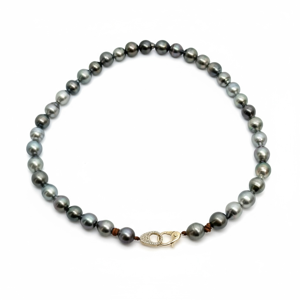 Tahitian pearls strung on tan leather with 14k gold pave diamond clasp.